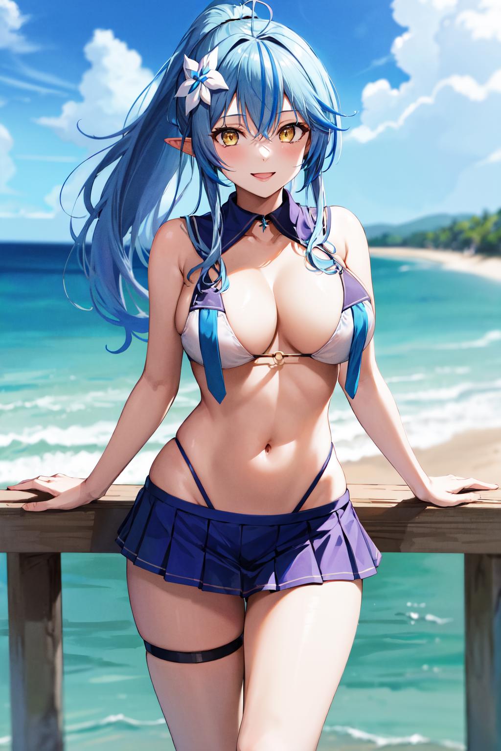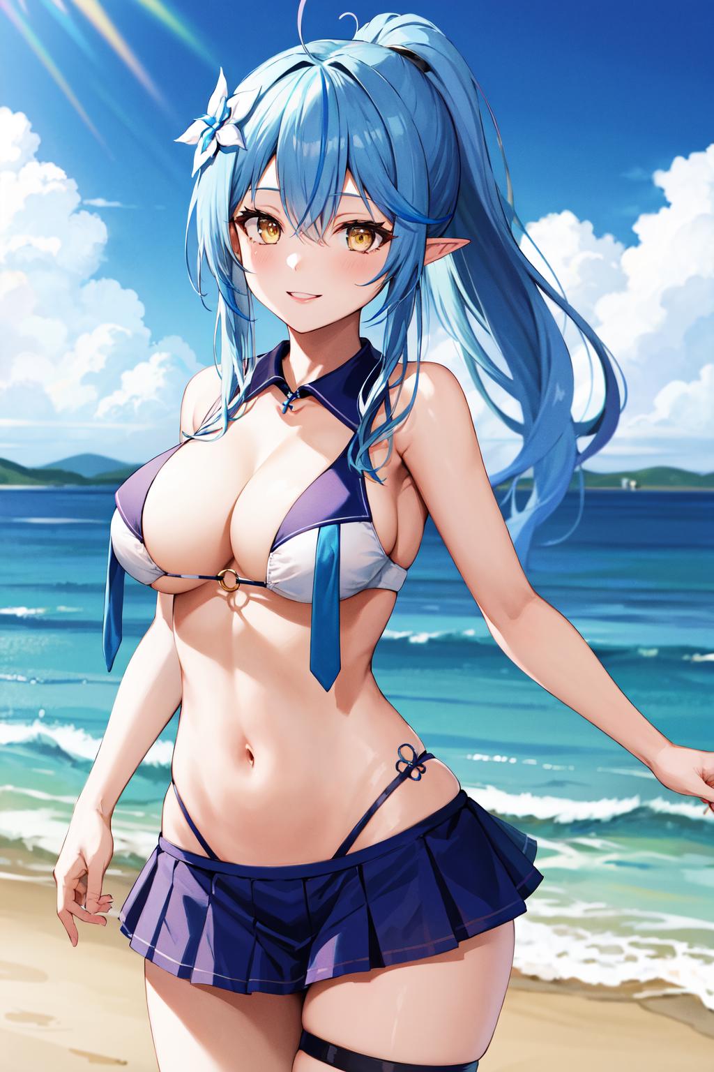 cclamy, ponytail, streaked hair, ahoge, hair flower, sailor collar, o-ring, sailor bikini, swimsuit, bikini skirt, pleated skirt, thigh strap