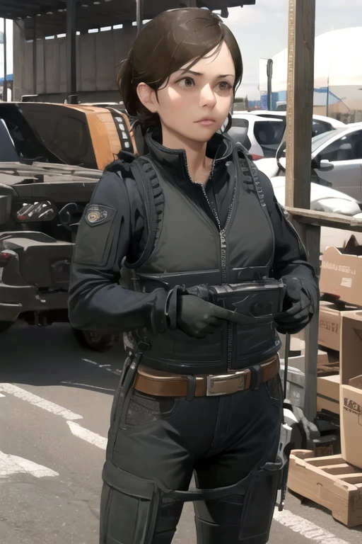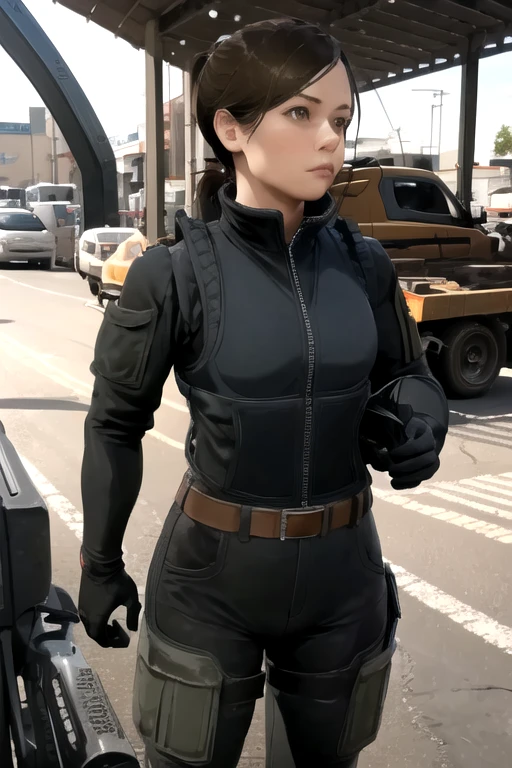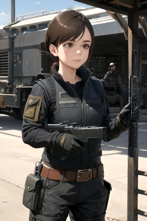 IlonaCOD, 1girl, solo, short hair, brown hair, brown eyes, ponytail, black gloves, belt, bulletproof vest, gun, military uniform, load bearing vest,