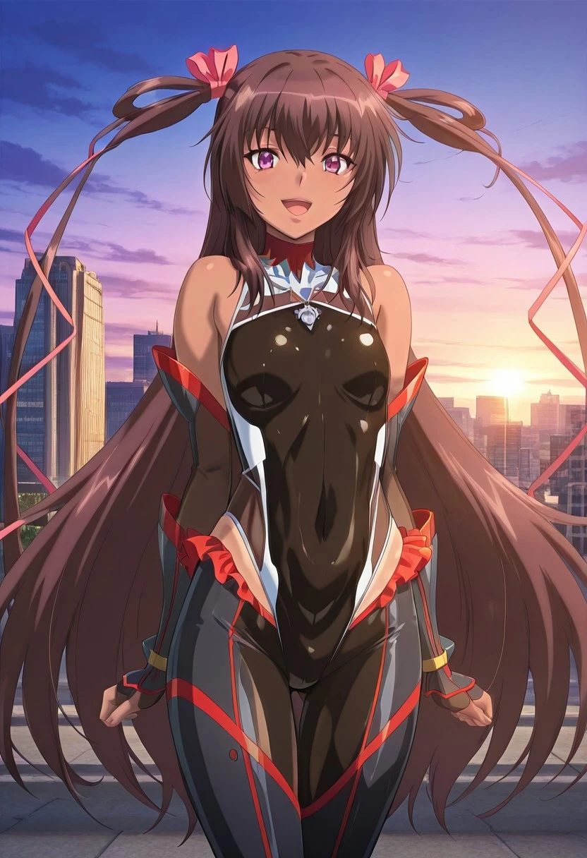 Yukikaze Mizuki,tanned skinned female,brown hair,long hair,twintails,flat breasts,purple eyes,