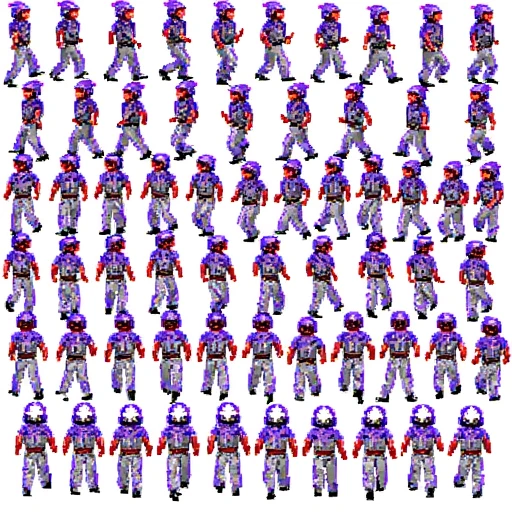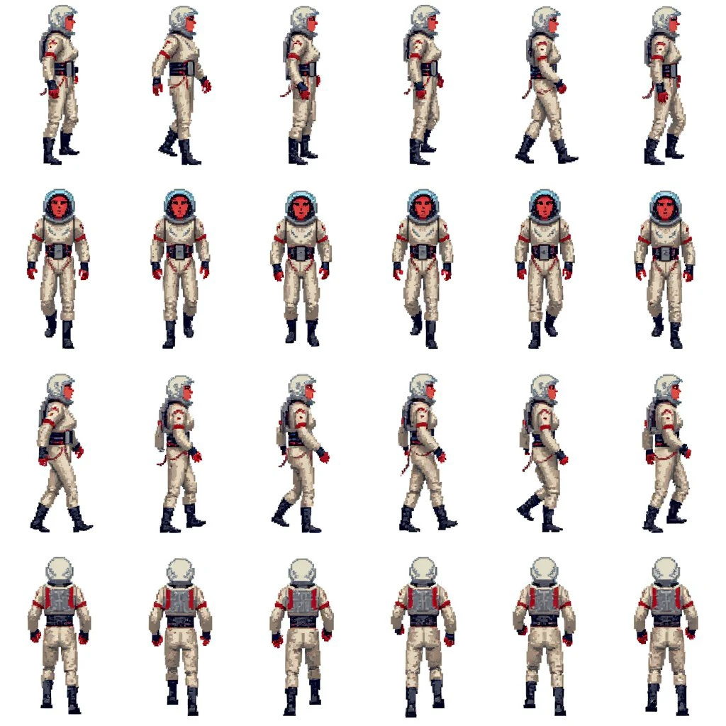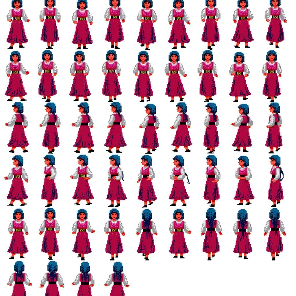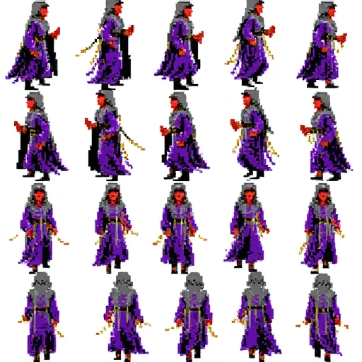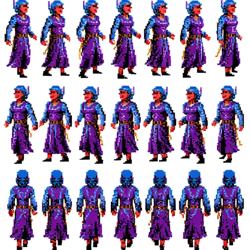 The LORA generates sprite sheets and characters that resemble Sierra On-Line SCI0 era EGA egos/characters.