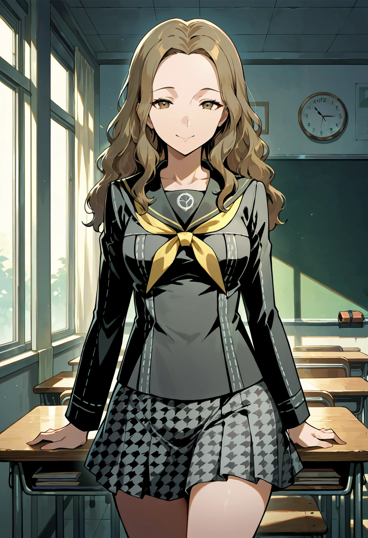 p4konishi, brown hair, long hair, wavy hair, brown eyes,School uniform: