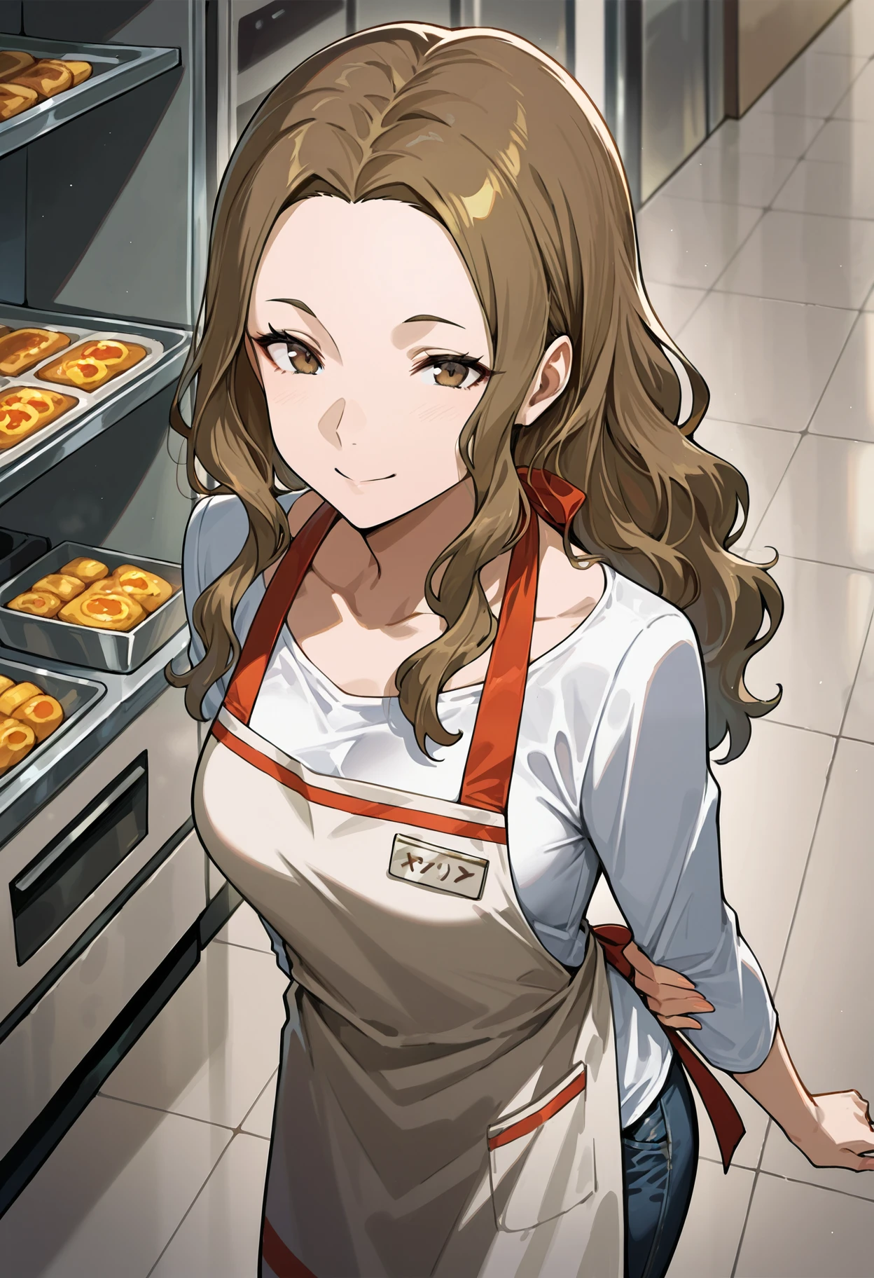 p4konishi-apron, apron, pants, jeans, white shirt, long sleeves, name tag,