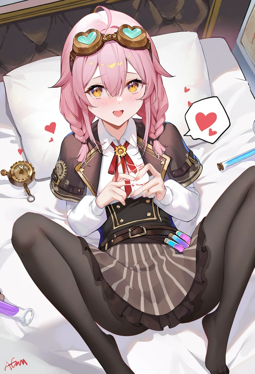 1girl,ace taffy,virtual youtuber,pink hair,brown eyes,yellow eyes,medium hair,braid,twin braids,hair between eyes,ahoge,goggles on head,flask,steampunk,vertical-striped clothes,