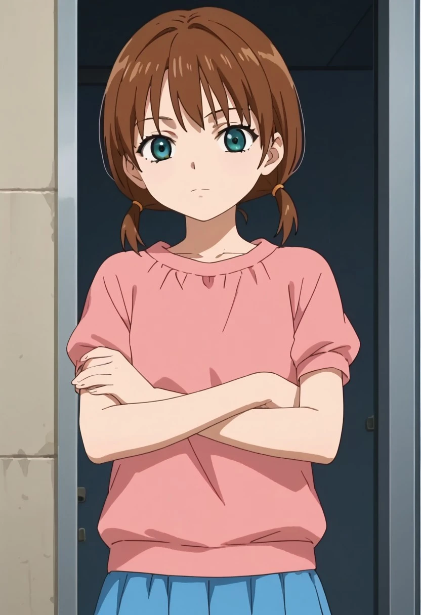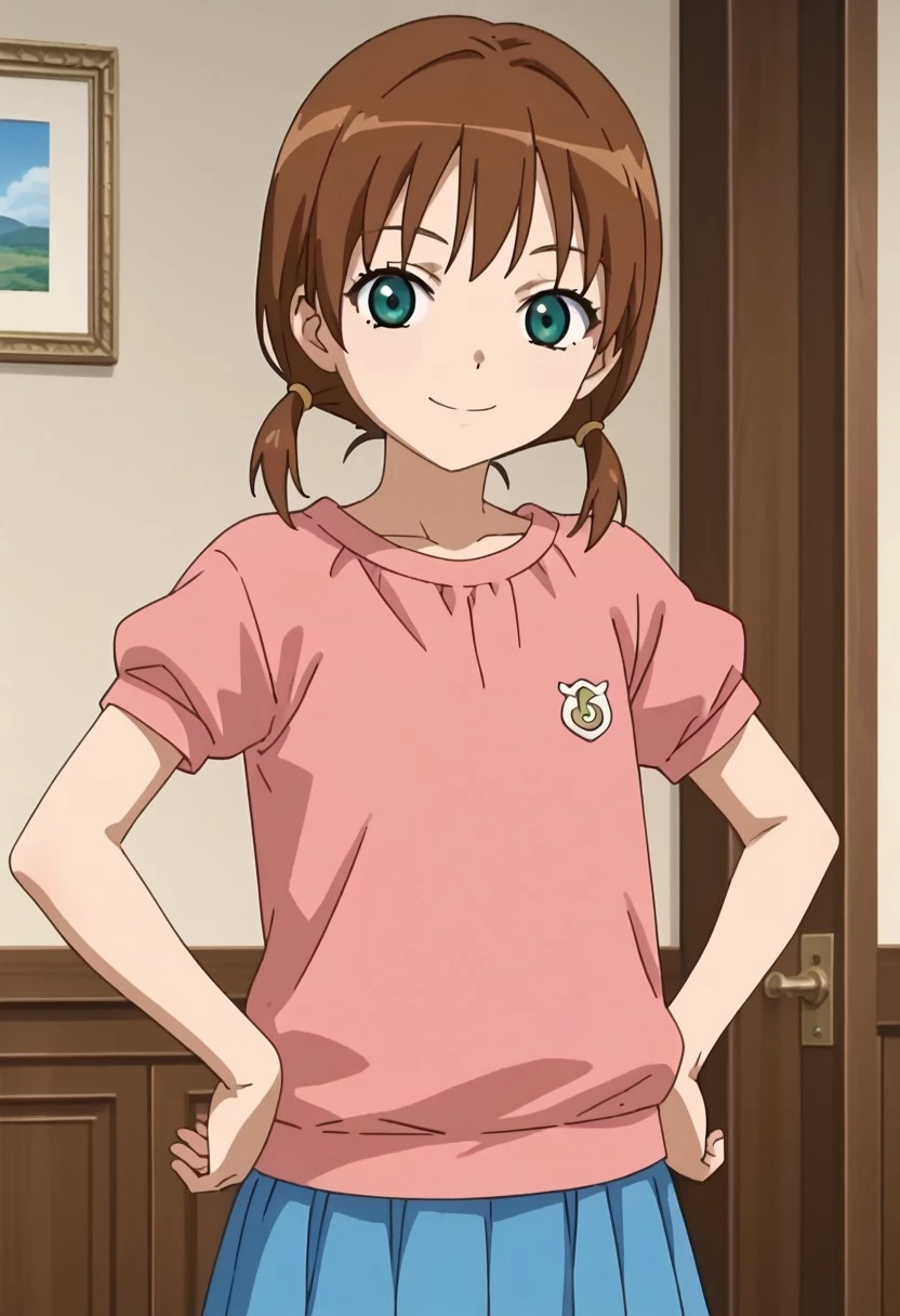 KristyDamonDSavers, 1girl, solo, green eyes, brown hair, skirt, twintails, blue skirt, pink shirt, short sleeves, short twintails, closed mouth, short hair, low twintails,
