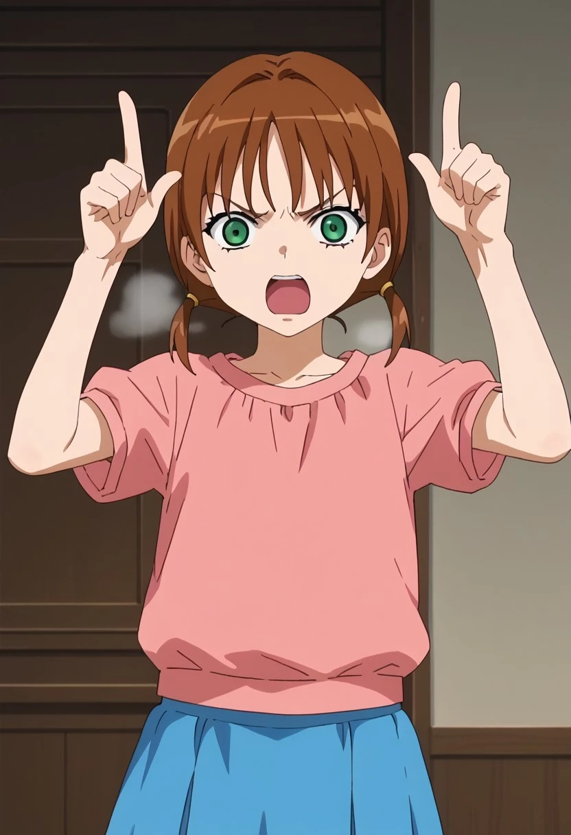 KristyDamonDSavers, 1girl, solo, green eyes, brown hair, skirt, twintails, blue skirt, pink shirt, short sleeves, short twintails, closed mouth, short hair, low twintails