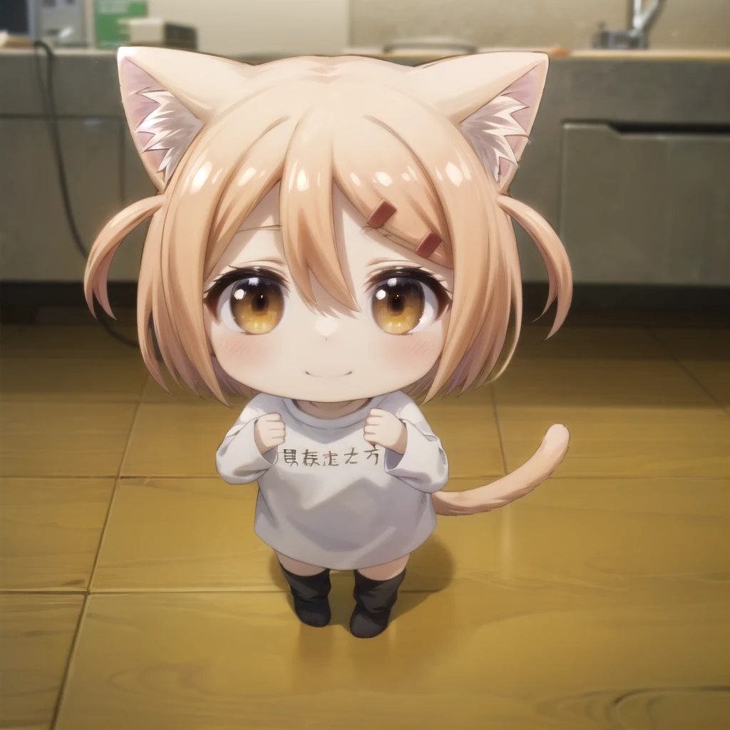 Maa, minigirl, animal ears, short hair, orange hair:1.2, brown eyes, hairclip, hair between eyes, two side up, blush, cat ears, tail, cat tail,bare legs, cat girl, white shirt, (black socks:1.4) ,shirt, long sleeves