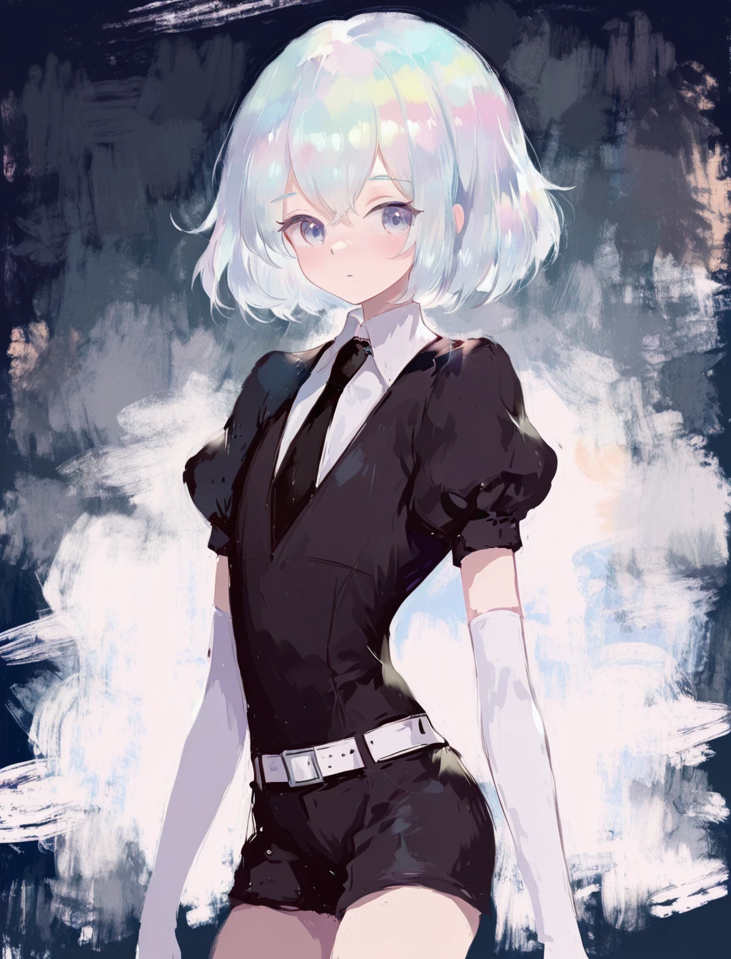 white shirt, black necktie, puffy short sleeves, black jacket, elbow gloves, white gloves, white thighhighs, white belt, black shoes