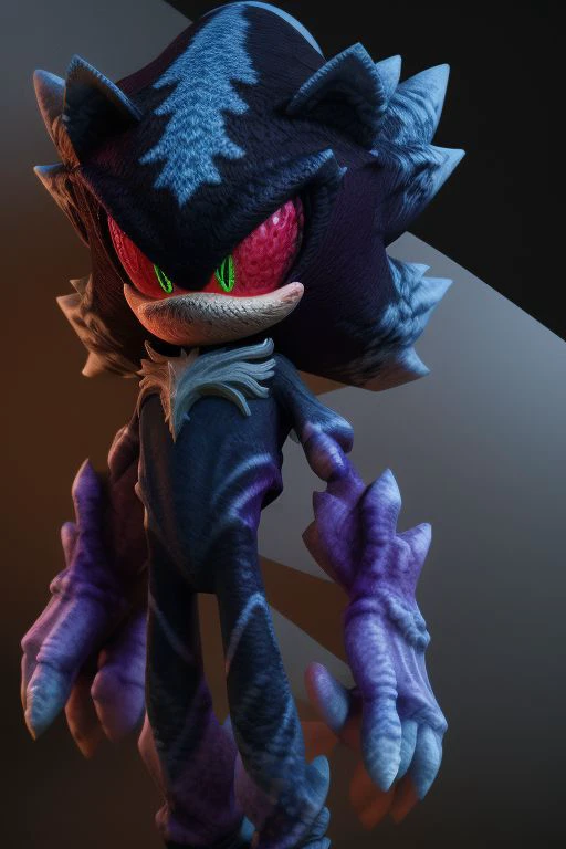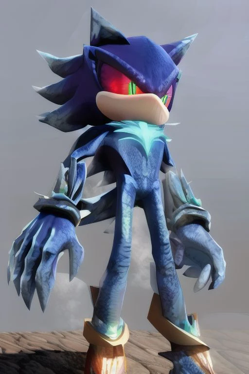 Mephiles The Dark, dark blue skin, light blue quills, reddish-pink sclera and lime green irises, claws, gray claws, purple mist