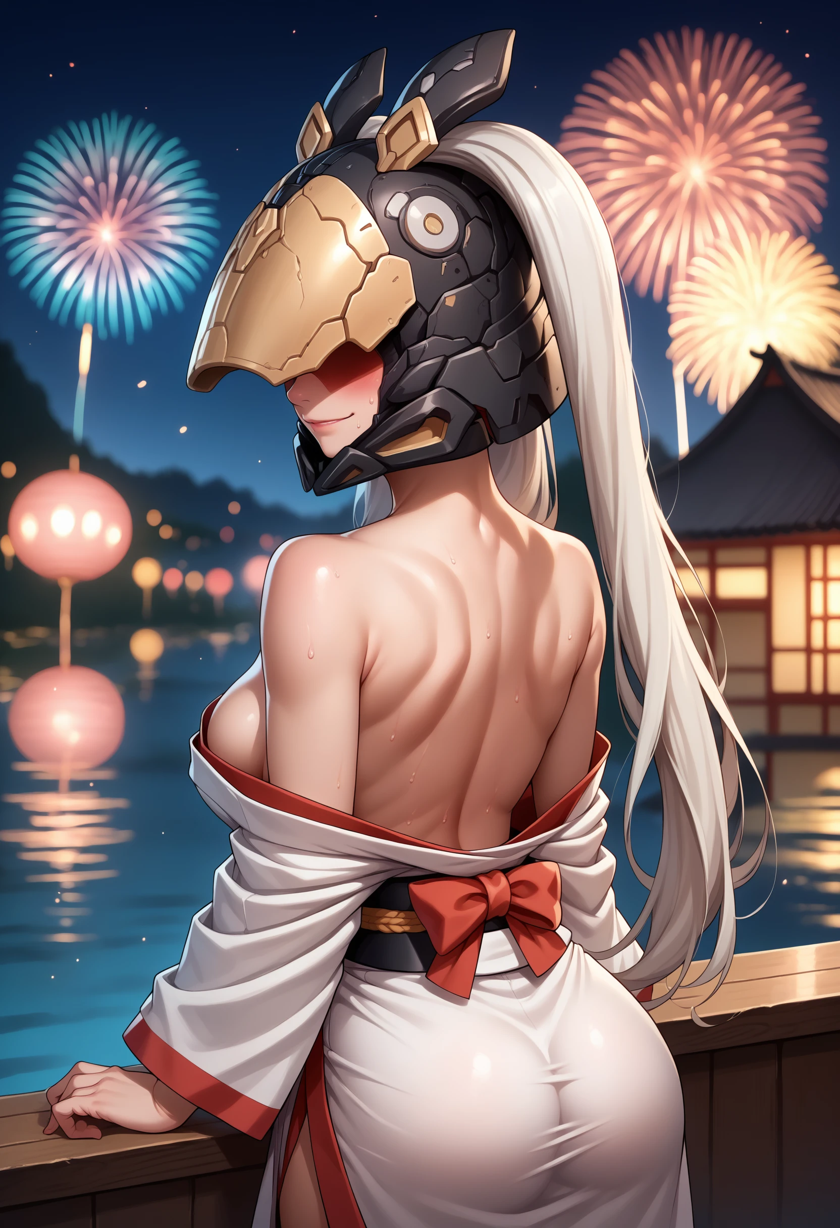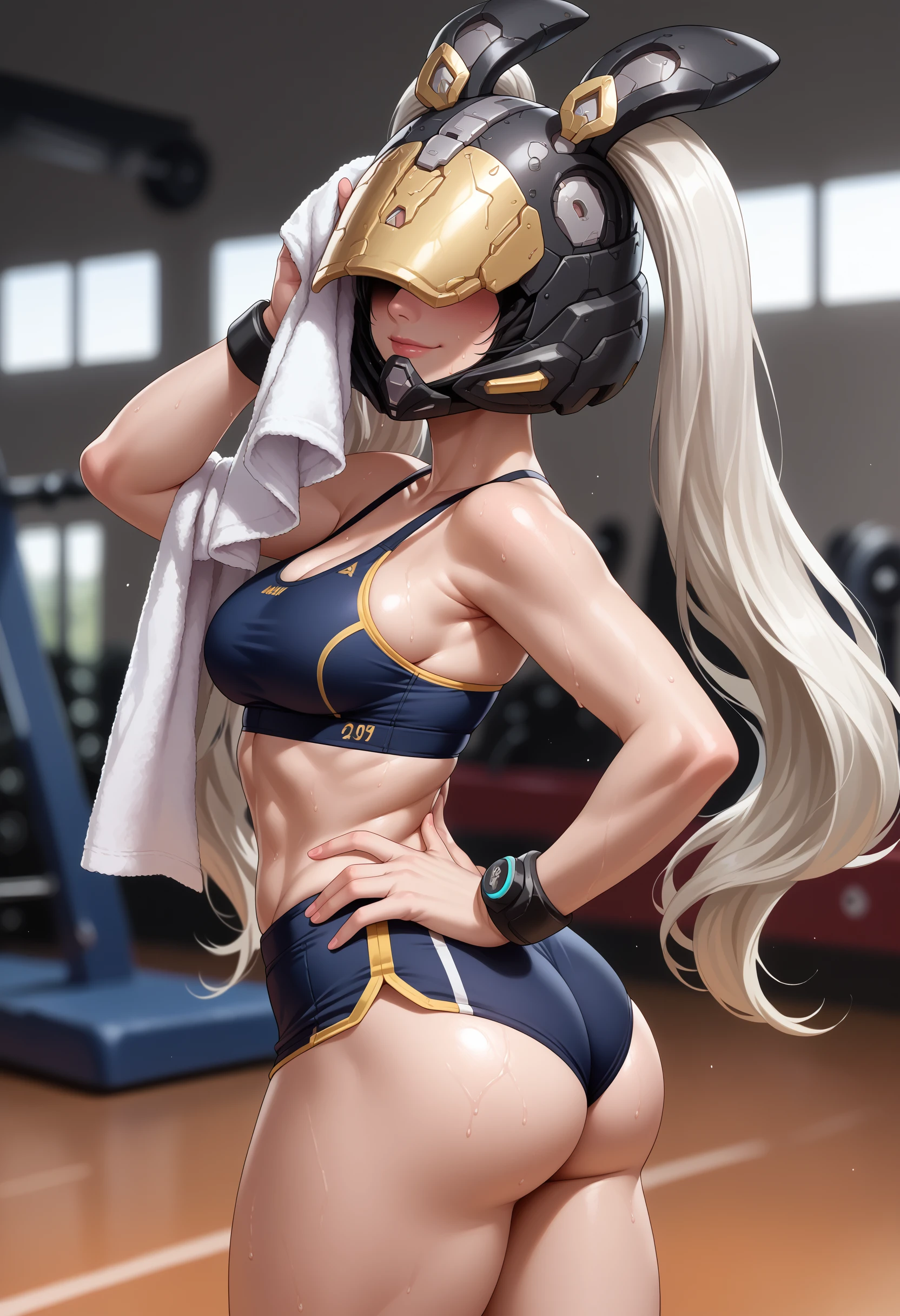 UltimateBnny, obscured eyes, covered eyes, medium breasts, twintails, long hair, white hair, animal ears, helmet
