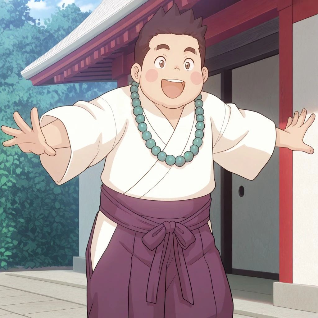 white kosode, green beaded necklace, purple hakama, zori sandals