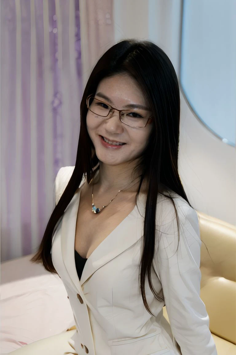 1girl, solo, medium breasts, looking at viewer, realistic, photorealistic, black hair, lips, long hair, black eyes, teeth, jewelry, freckles, glasses, smile, grin, necklace,