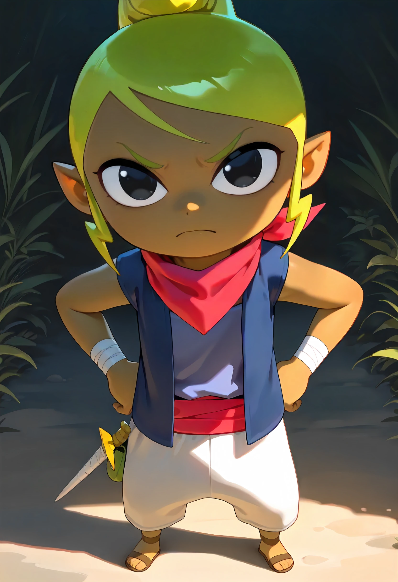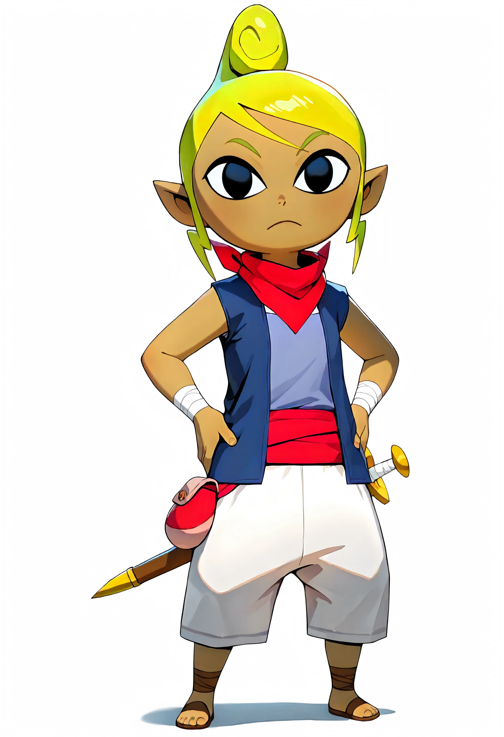 1girl, Tetra, solo, child, female child, blonde hair, sideburns, hair bun, black eyes, pointy ears, tan skin,