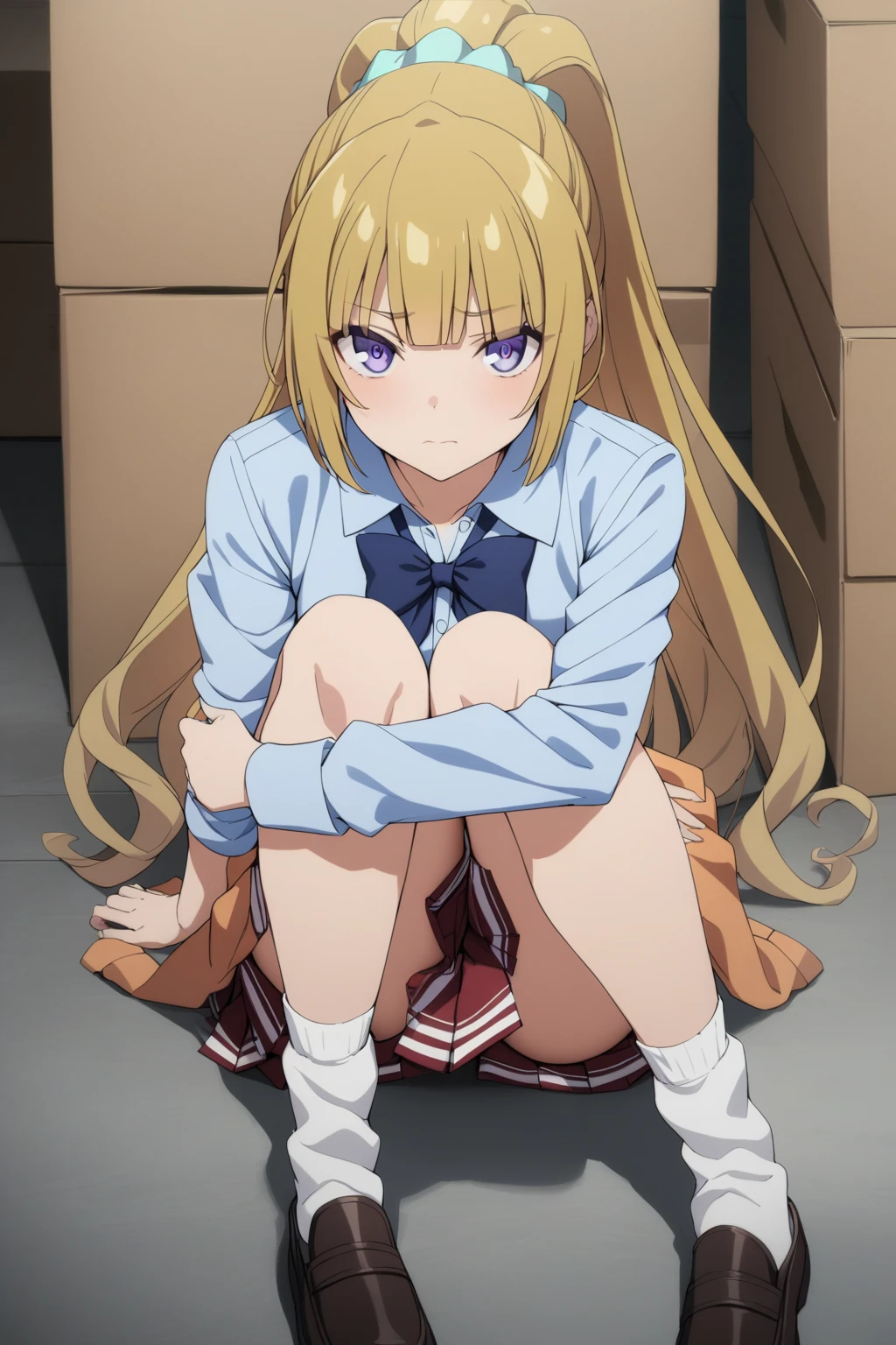 Base Prompt: karuizawa, 1girl, blonde hair, ponytail, hair scrunchie, blunt bangs, purple eyes, blunt bangs, purple eyes,