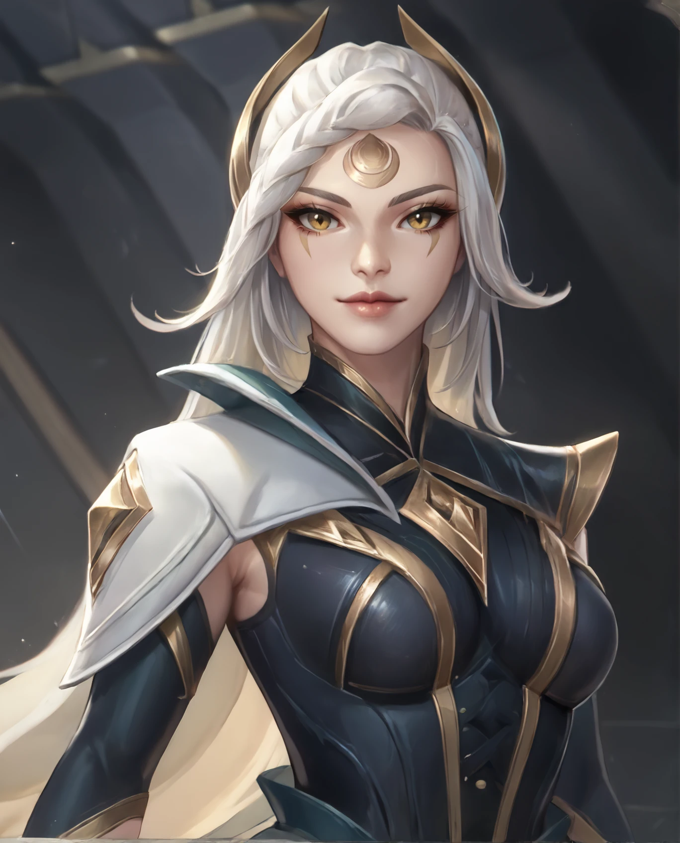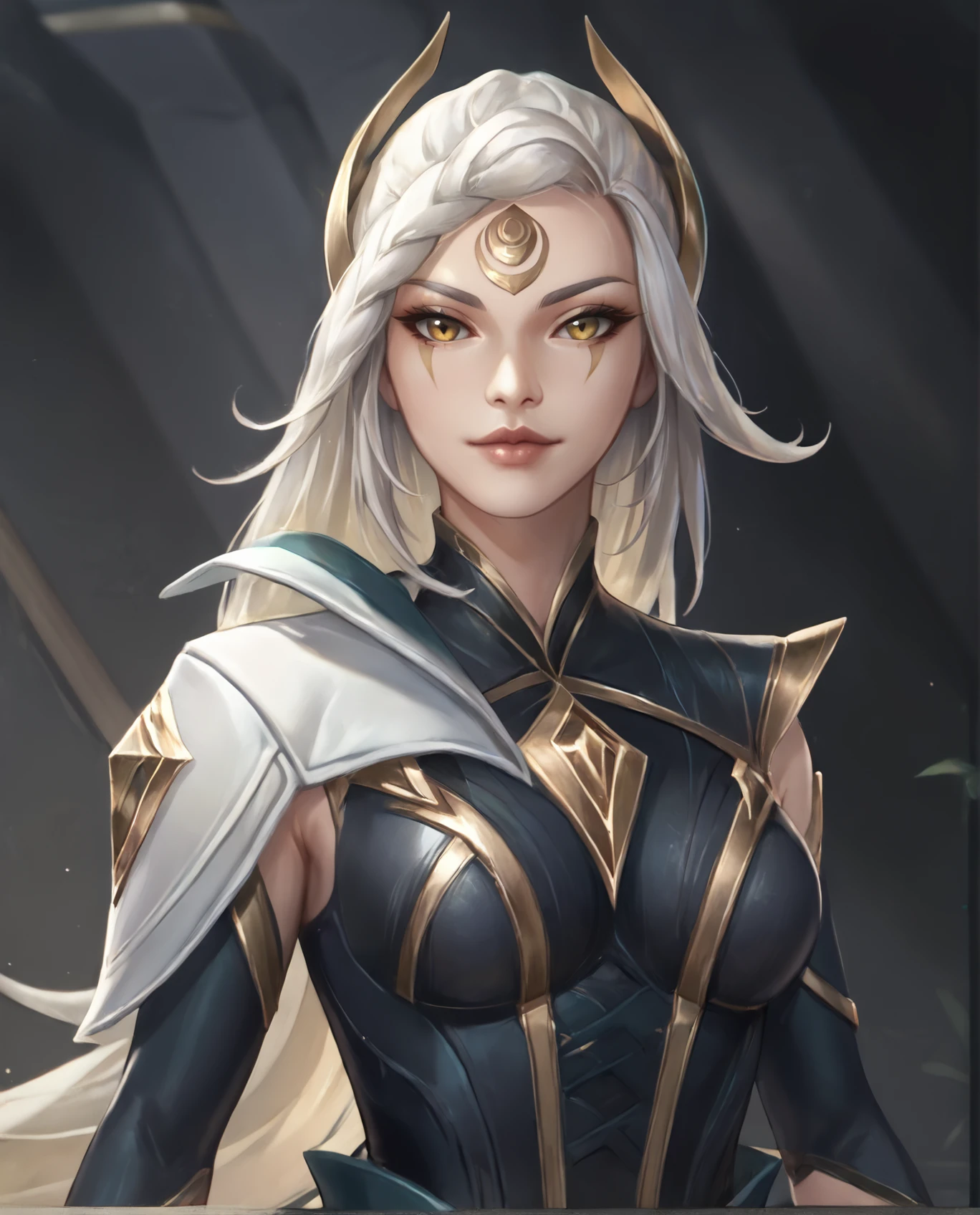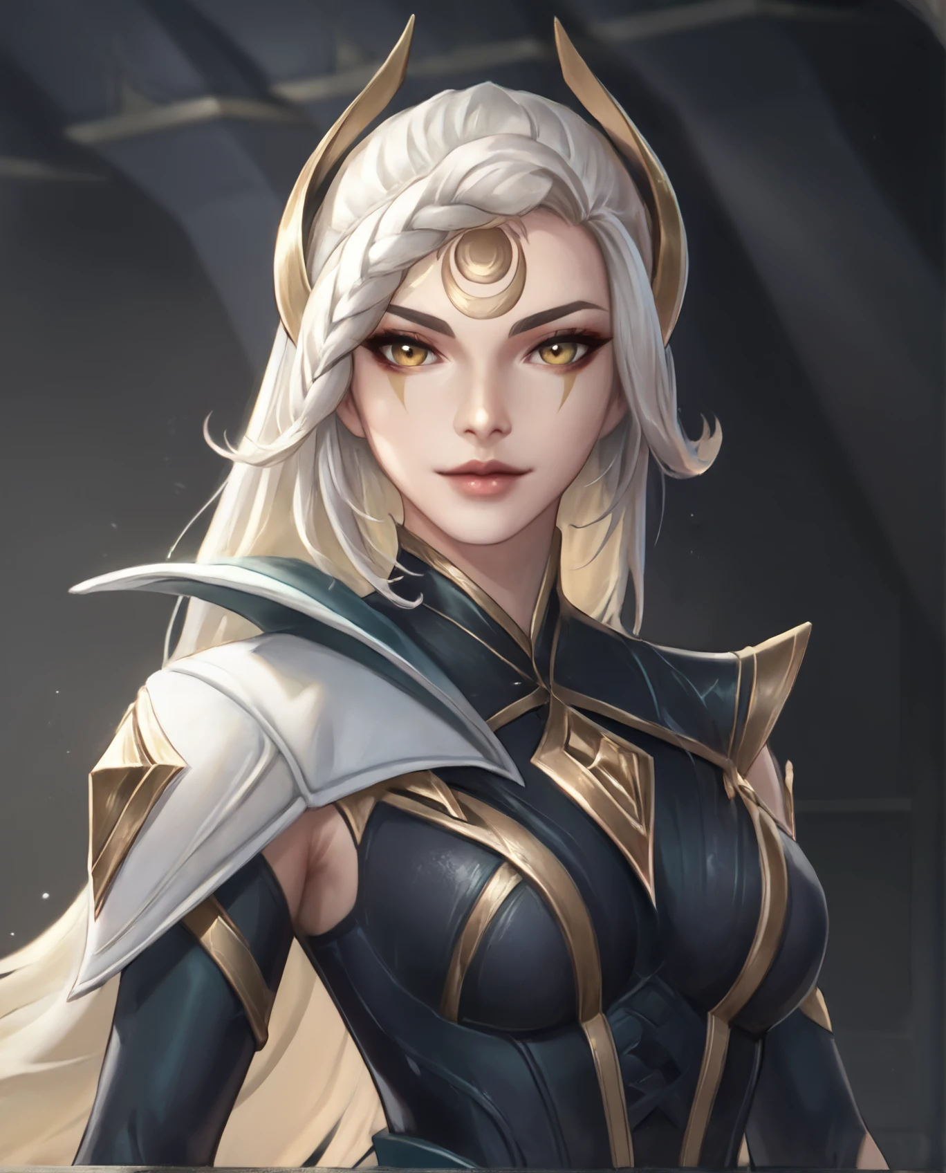 golden eyes, white hair, long hair, forehead marking, armor, hair ornament,