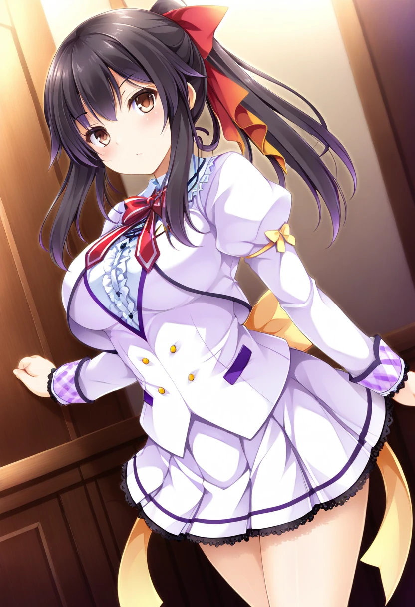 aa1, 1girl, solo, long hair, black hair, brown eyes, ponytail, red and yellow hair ribbons