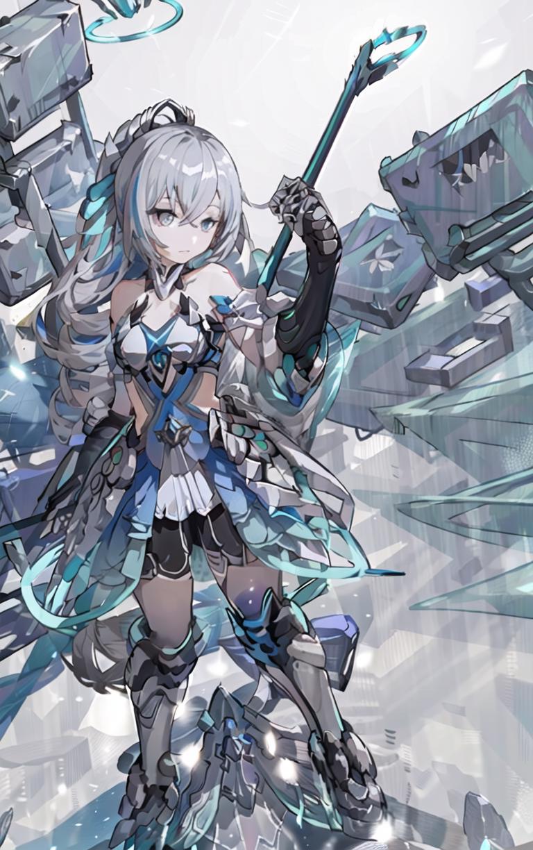 long_hair,drill_hair, breasts, symbol-shaped_pupils, ponytail,very_long_hair,multicolored_hair,bare_shoulders,small_breasts, eyebrows_visible_through_hair, bangs, hair_between_eyes,