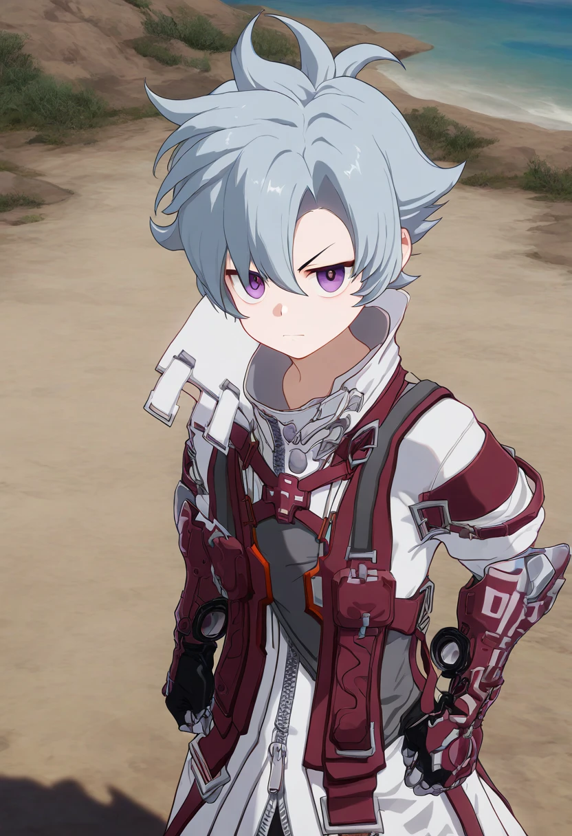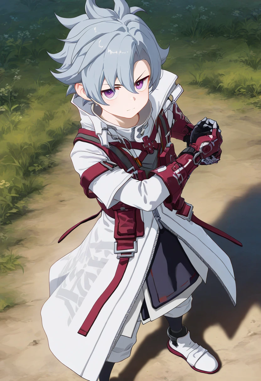 二阶的衣服触发词:long coat,red buckle,white coat,open coat,white pants,white footwear,armored gloves,black leggings,red gloves,black leggings,red strap