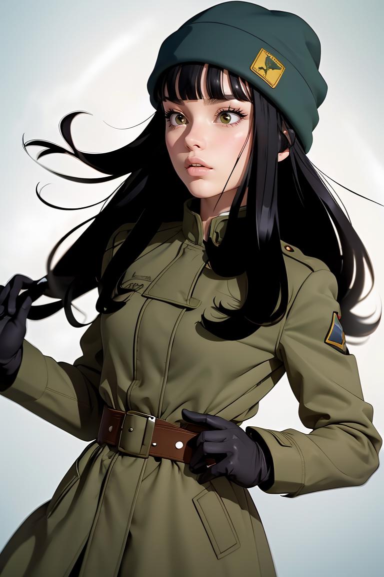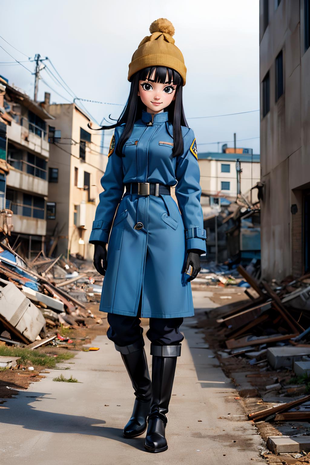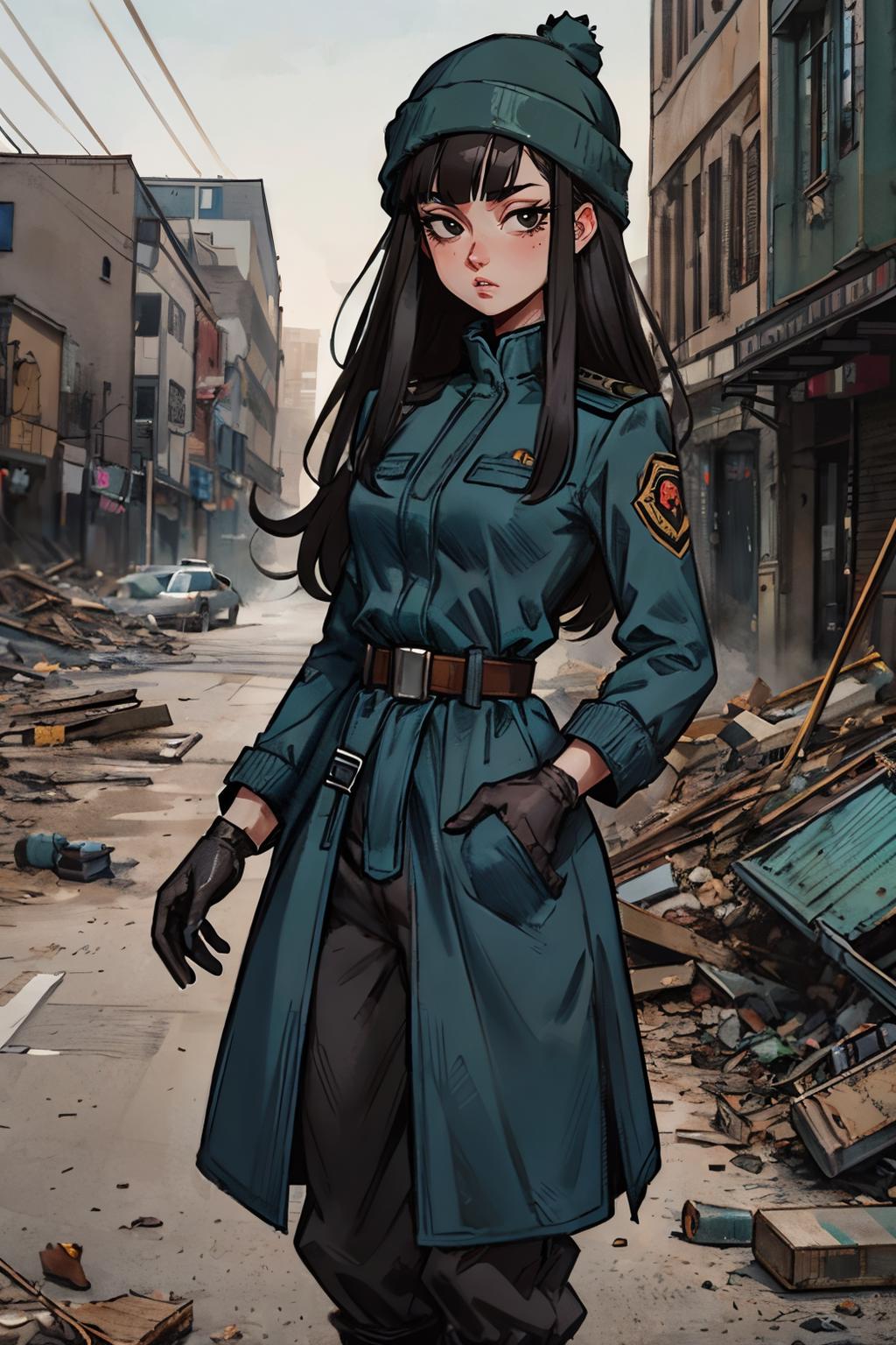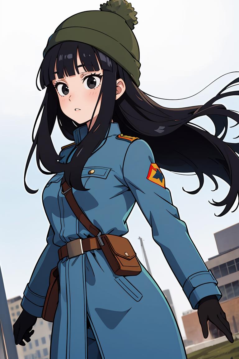 black gloves, belt, uniform, long sleeves, military uniform, blue coat, trench coat, pants,