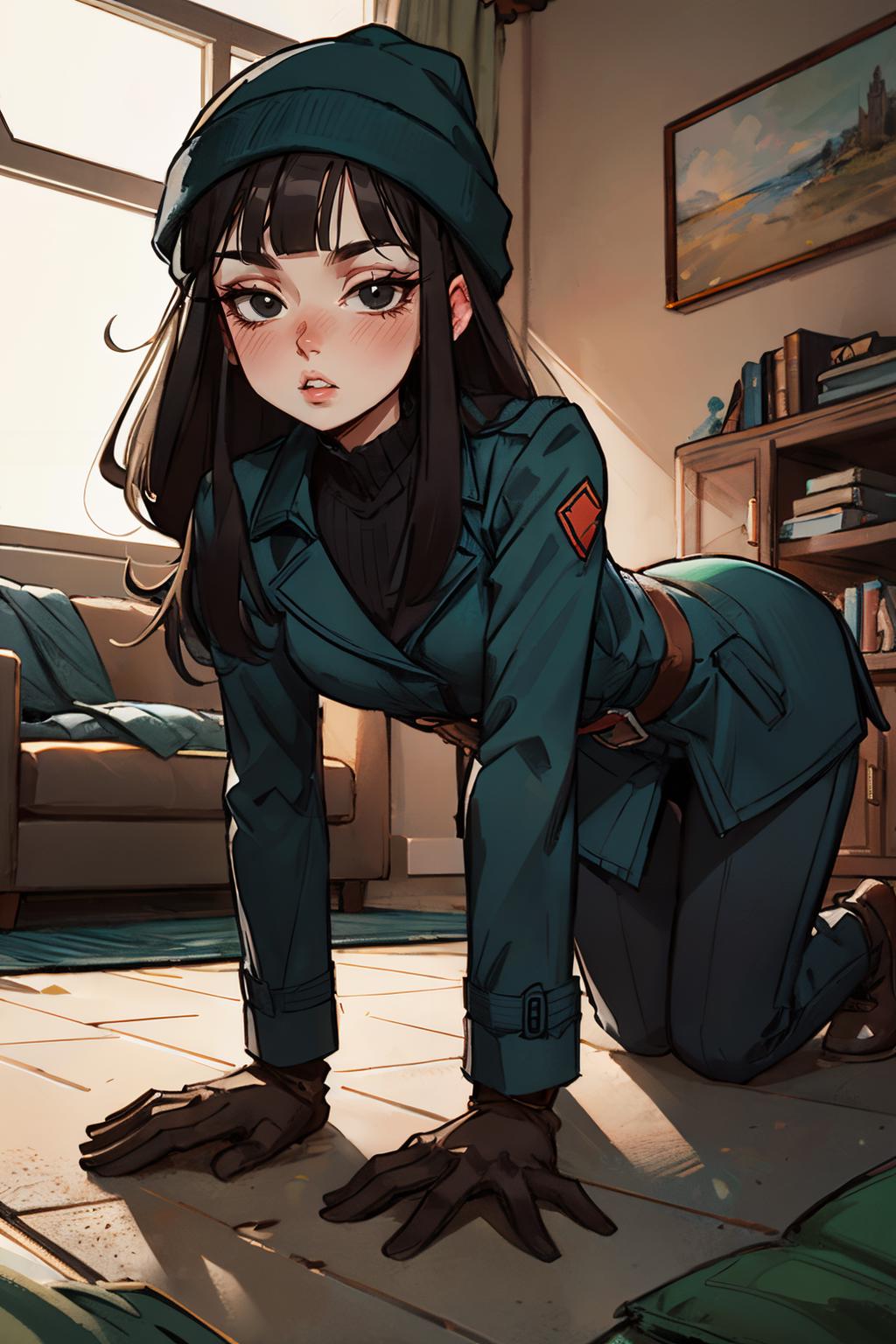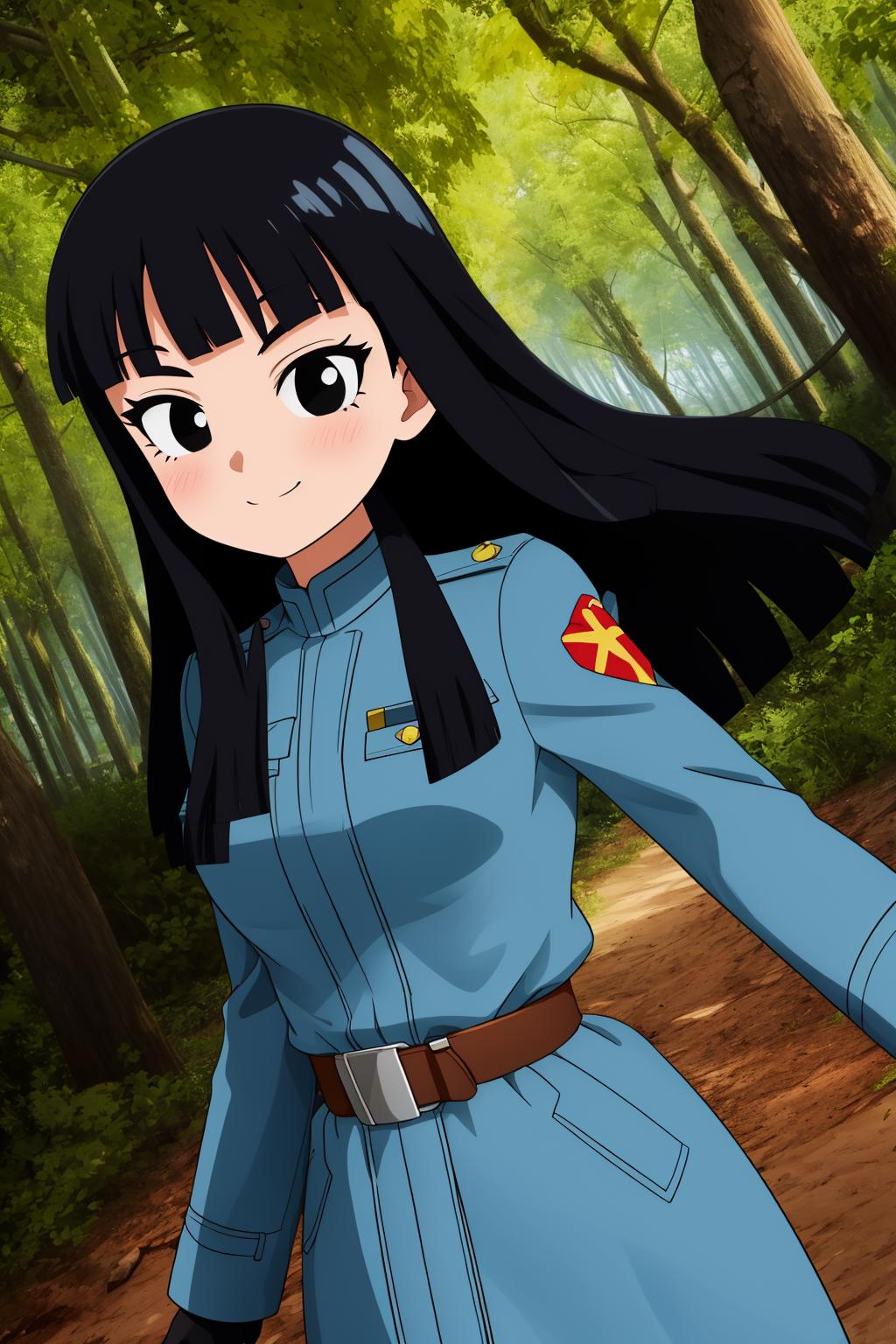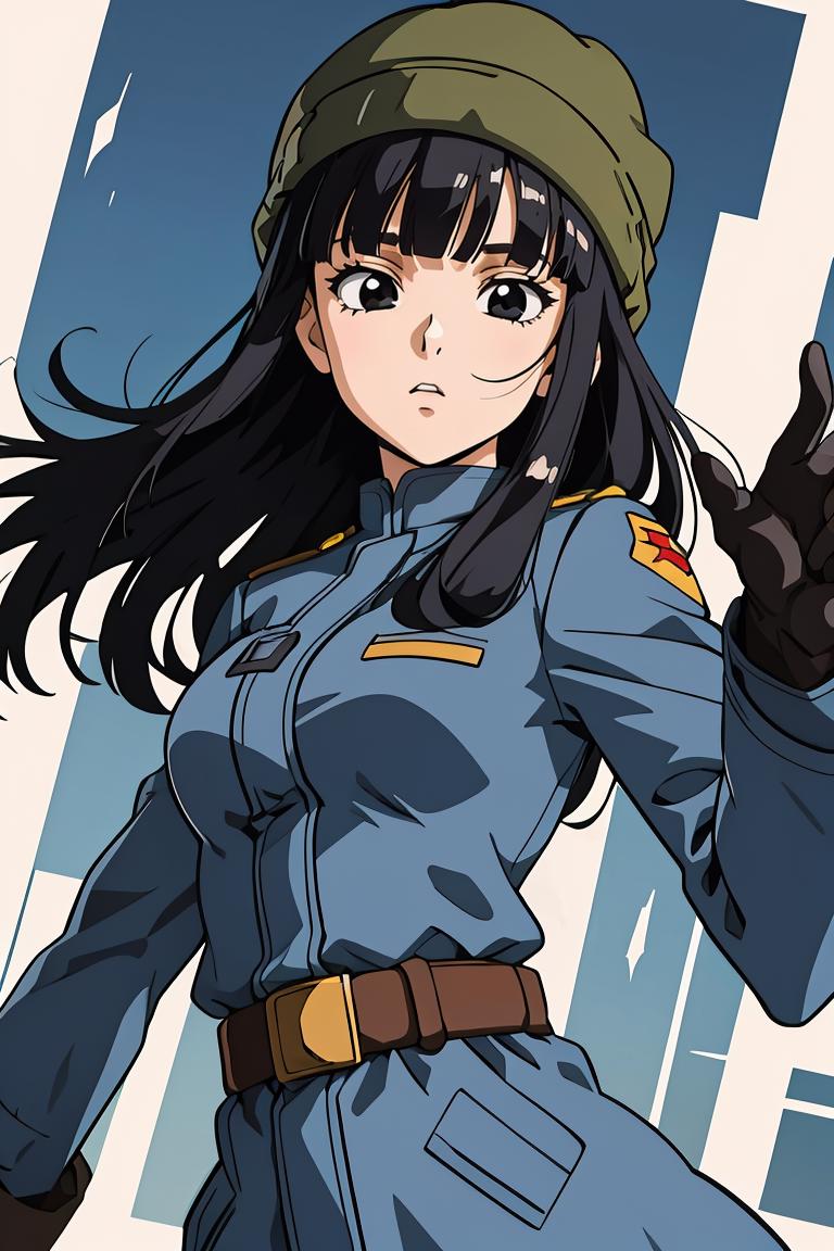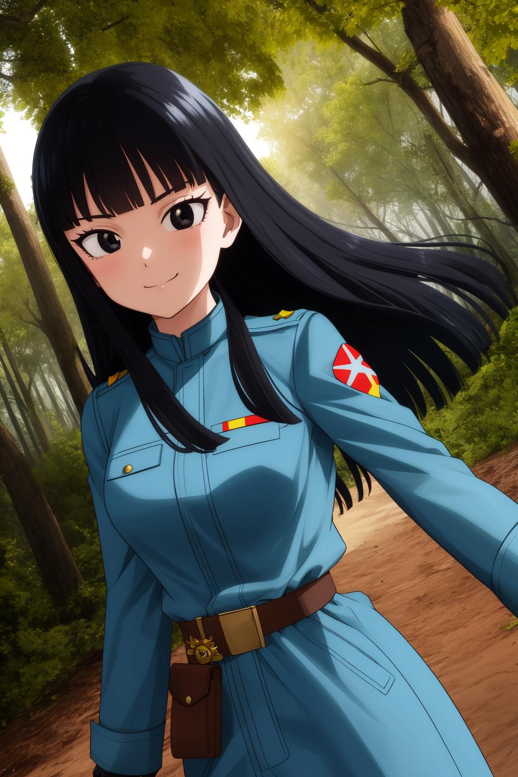 black gloves, belt, uniform, long sleeves, military uniform, blue coat, trench coat, pants,
