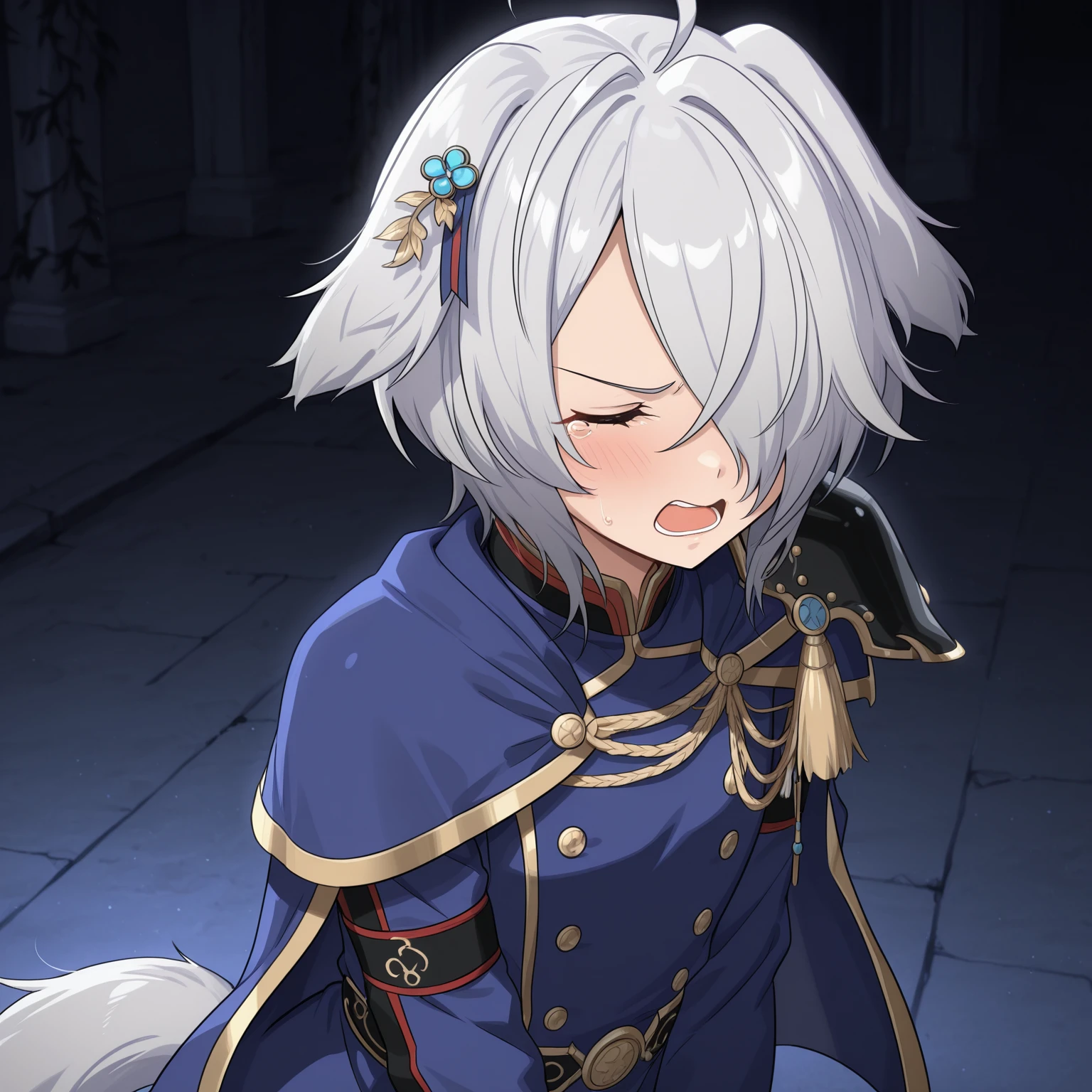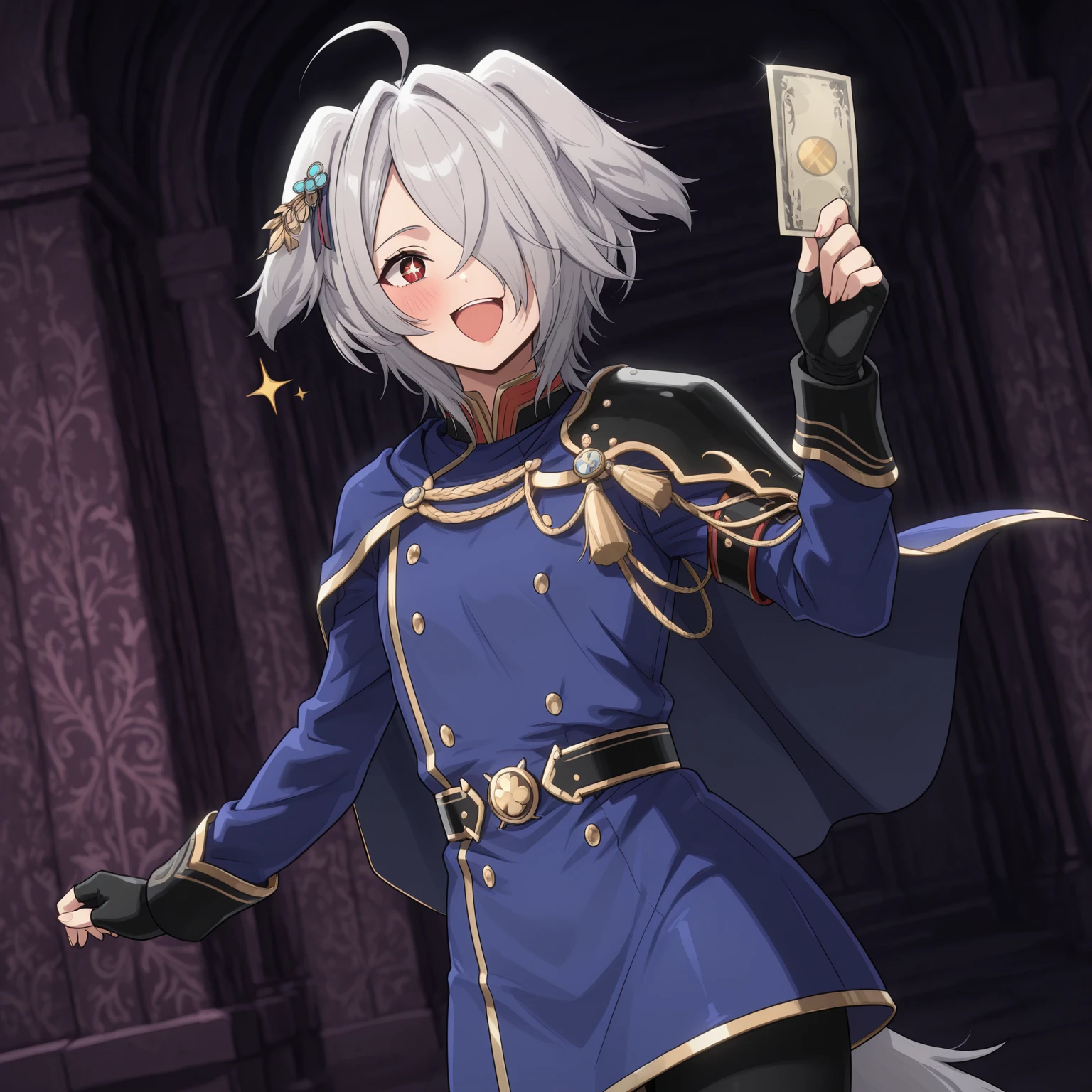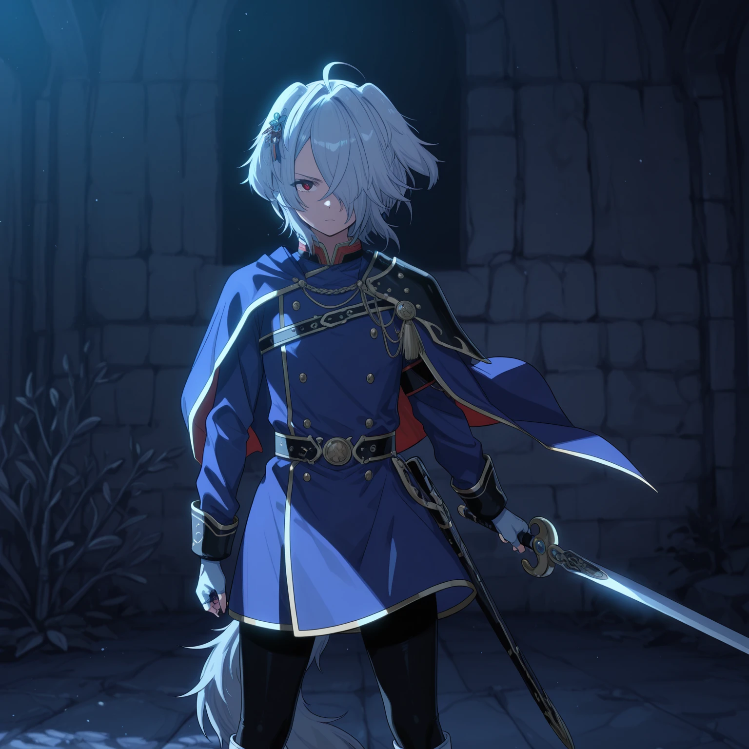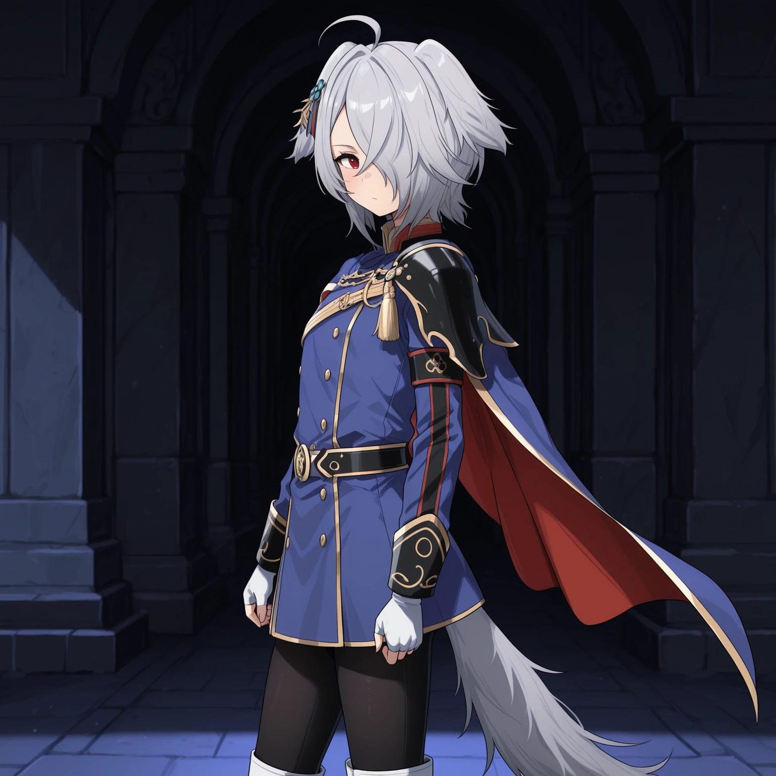 military uniform, blue coat, double-breasted, gold trim, high collar, epaulettes, cloak, ornamental chain, medal, belt, belt buckle, fingerless gloves, black leggings, white boots, knee boots,