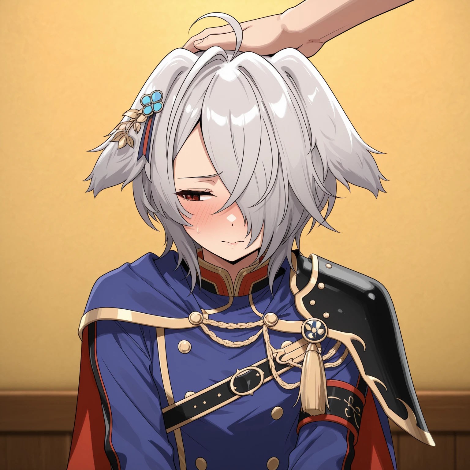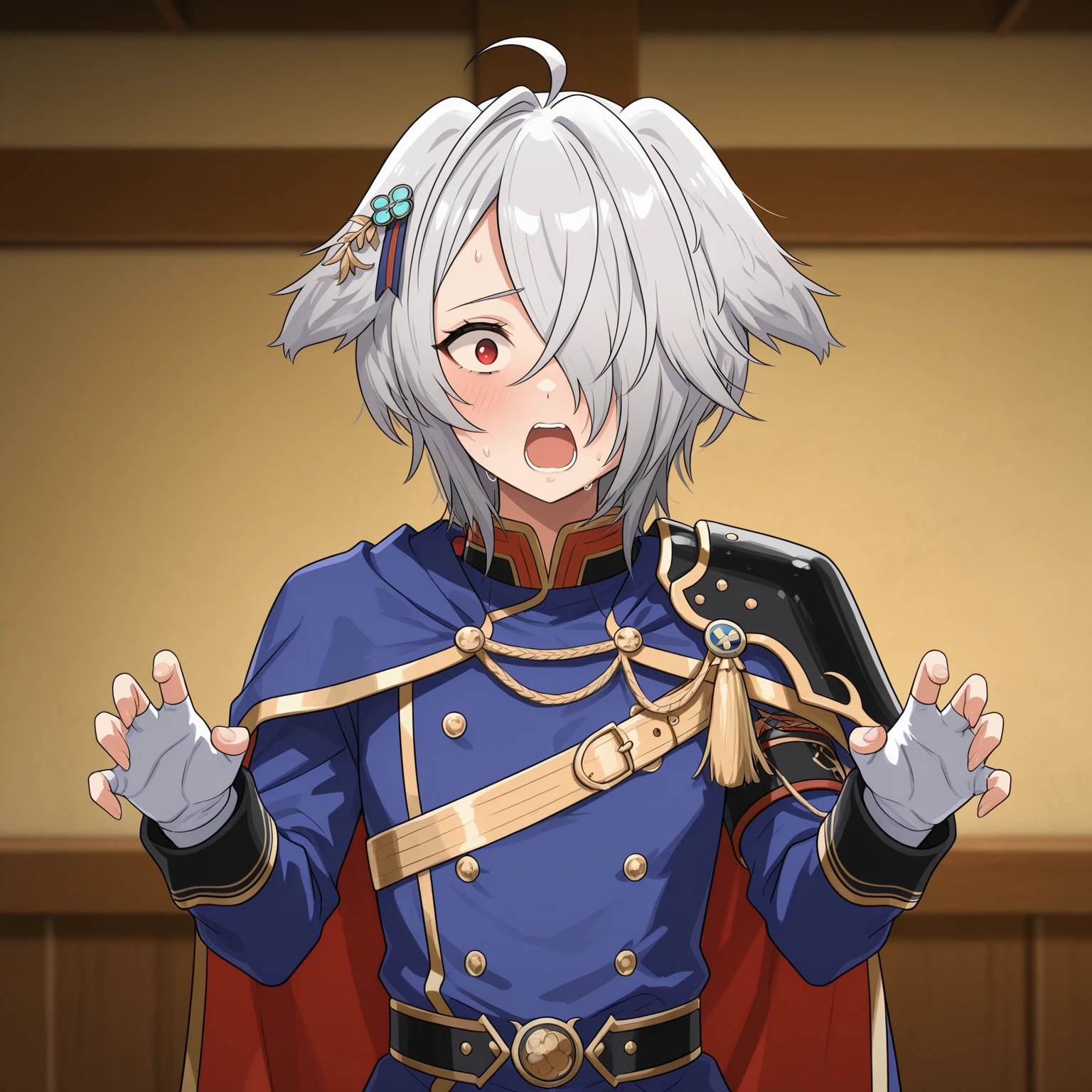 grey hair, short hair, ahoge, asymmetrical bangs, hair over one eye, red eyes, hair ornament, hairclip,
