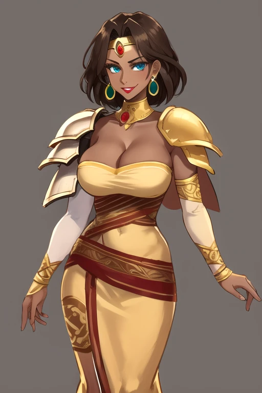 MissTil, 1girl, solo, smile, short hair, blue eyes, large breasts, brown hair, cleavage, jewelry, green eyes, earrings, dark skin, armor, dark-skinned female, long skirt, lipstick, circlet, neck ring, forehead jewel, yellow dress, strapless