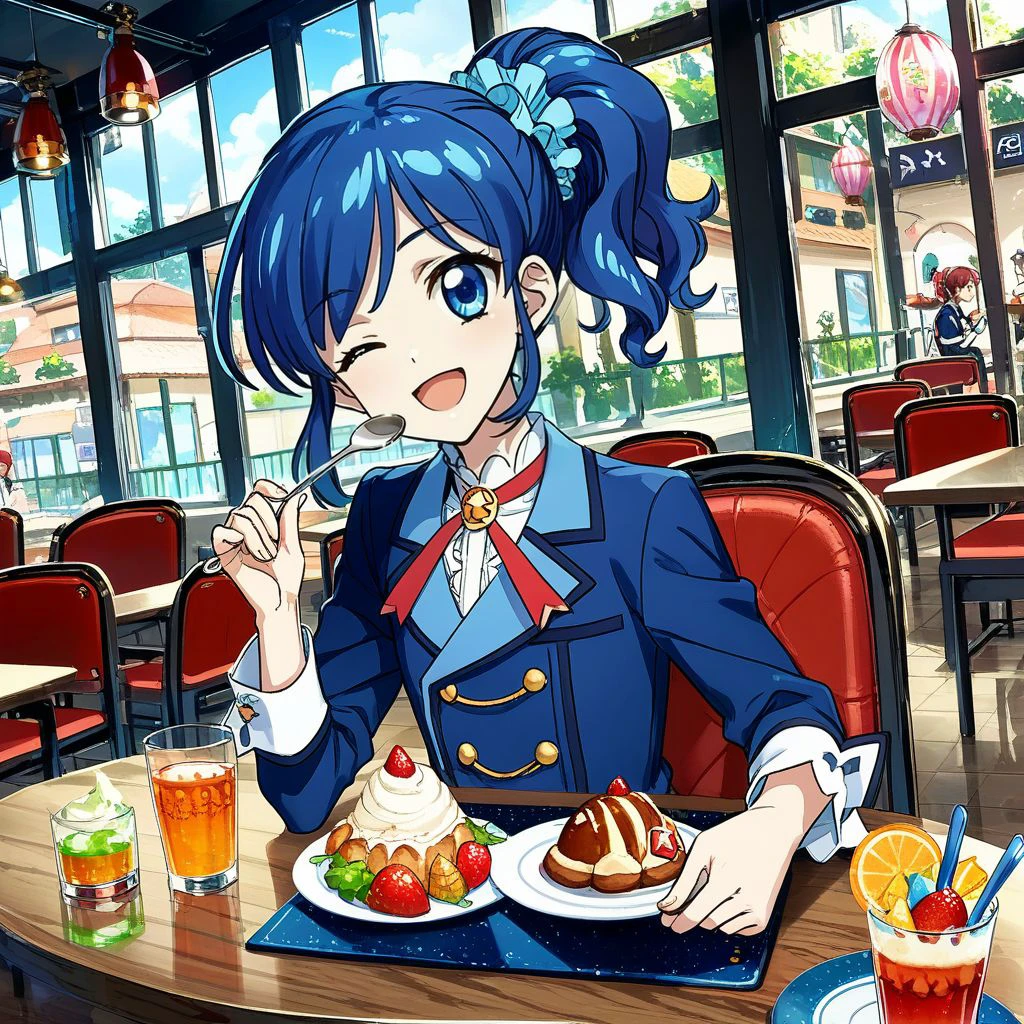 trigger: kiriya aoi, blue hair, blue eyes, side ponytail, long hair,hair scrunchie, blue scrunchie, starlight academy school uniform,blue jacket,white skirt, white footwear, knee boots,
