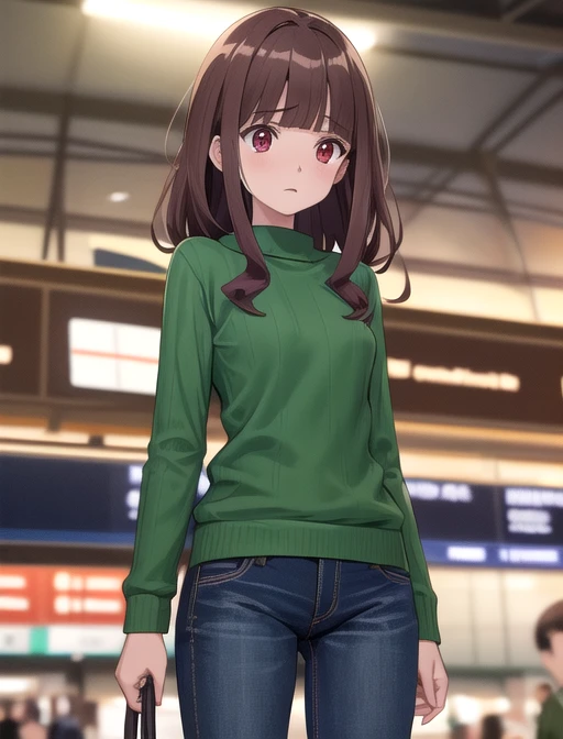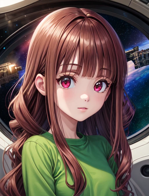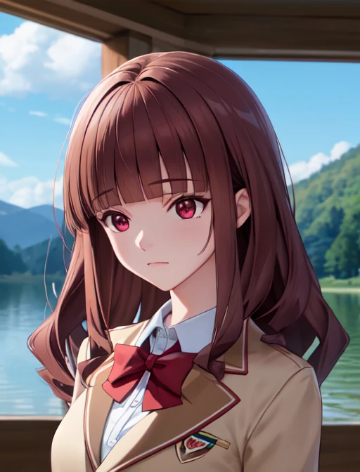 Additional words that may help: brown hair, blunt bangs, red eyes,