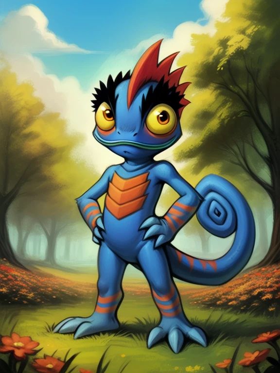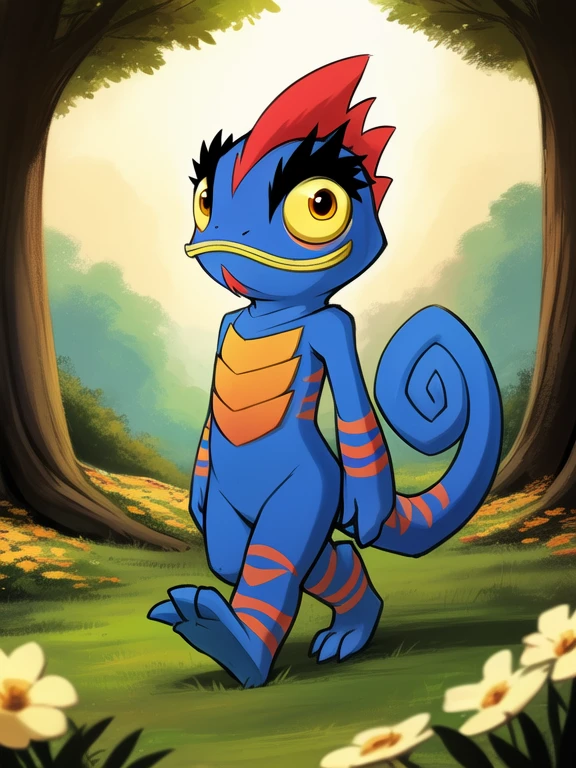 Fredmeleon, chameleon, lizard, yellow sclera, yellow eyes, tail, chibi, blue skin,