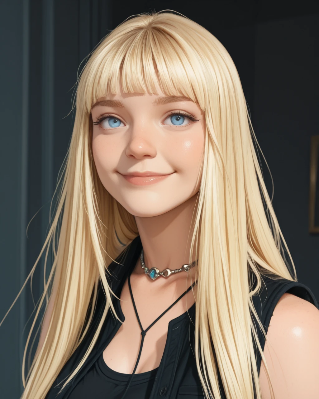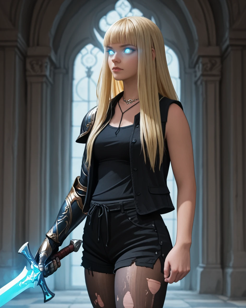 Triggers: anyamagik, 1girl, long hair, blonde hair, bangs, blue eyes, black shirt, vest, jewelry, necklace, shorts, pantyhose, torn pantyhose,