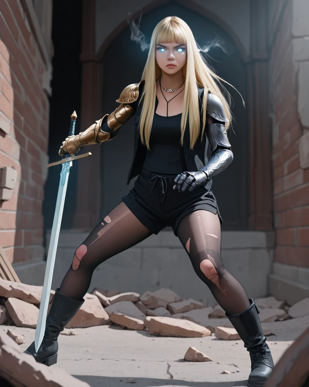 anyamagik, 1girl, long hair, blonde hair, bangs, blue eyes, black shirt, vest, jewelry, necklace, shorts, pantyhose, torn pantyhose, , single shoulder armor, single gauntlet, single glove, sword