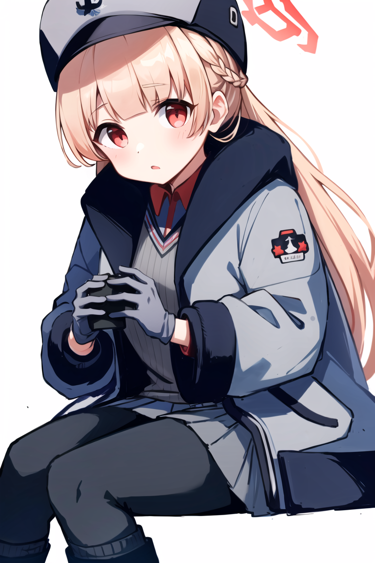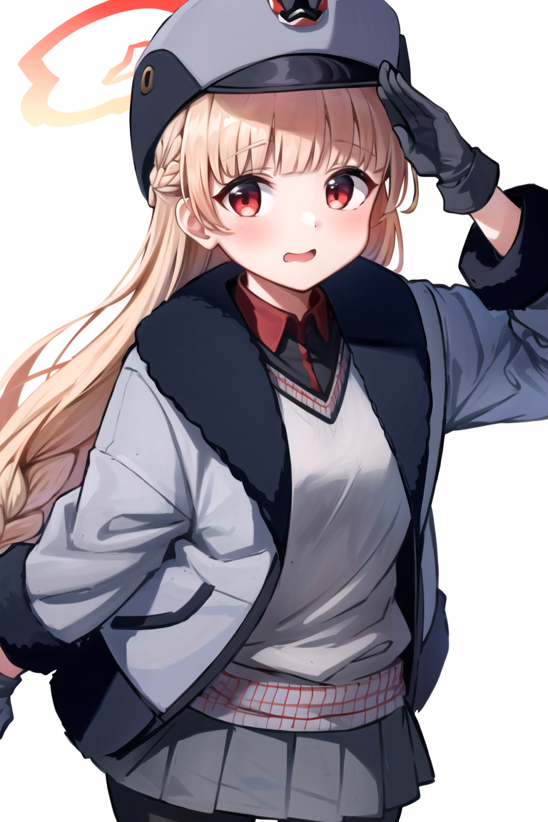 If you want normal version, add following tags: amami nodoka, long hair, looking at viewer, skirt, blonde hair, red eyes, gloves, hat, jacket, braid, black pantyhose, halo