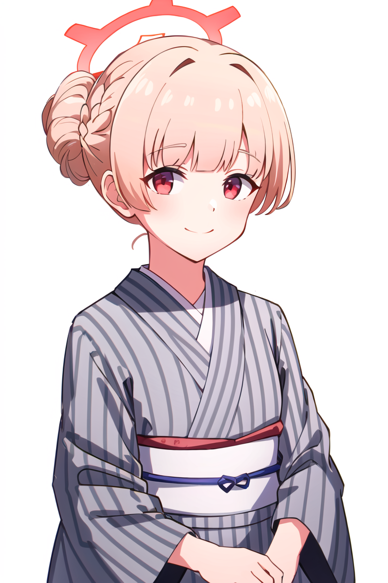 If you want Hot Spring version, add following tags: amami nodoka, bangs, red eyes, long sleeves, upper body, braid, japanese clothes, wide sleeves, kimono, sash, halo, obi, single hair bun, vertical stripes, striped kimono