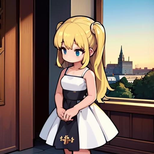<lora:ROnpc-22:0.6> a girl wearing a short flowing dress, ronpc, detailed, sharp focus, church background, full body shot