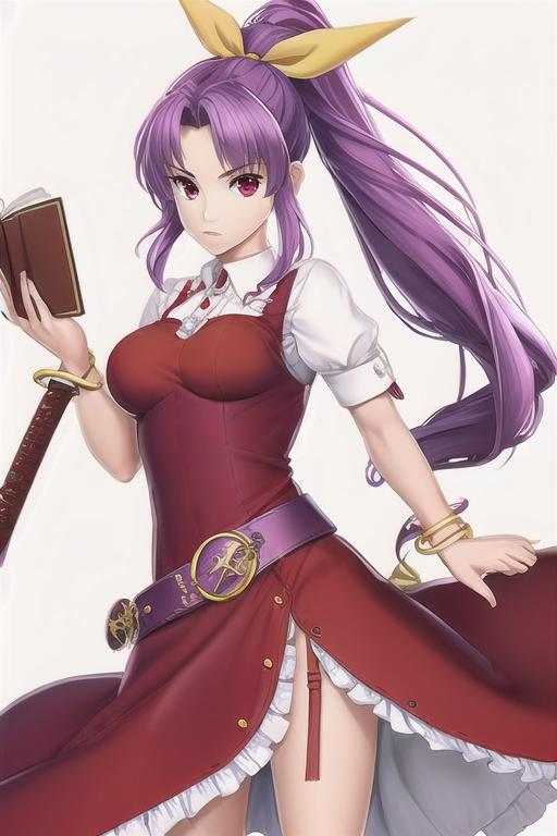 solo, 1girl, purple_hair, long_hair, ((hair_ribbon, ((yellow_ribbon)))), ((single_strap, loose_belt)):8, bangs, red_eyes, large_breasts, white_shirt, frills, collared_shirt, puffy_short_sleeves, sleeveless, very_long_hair, purple_eyes, high_knee_boots, brown_footwear, cross-laced_footwear, gold_bracelet, ((long_skirt, opened_long_skirt)), high_heels, sheath, ponytail, ((red_dress)), red_pinafore_dress, katana, sheathed, expressionless,