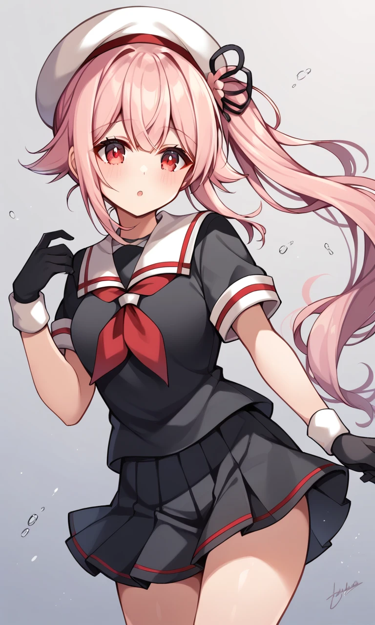harusameKC,long hair,red eyes, hat, school uniform, pink hair, short sleeves, pleated skirt, black gloves ,white wristband, hair flower, black skirt, side ponytail, black shirt, beret, white headwear, hair flaps, red neckerchief, black serafuku, white sailor collar, multicolored hair,