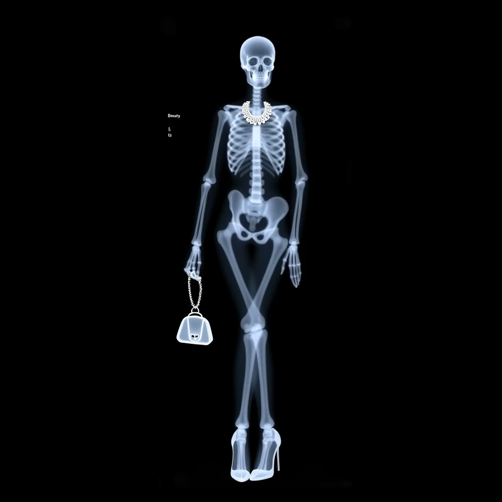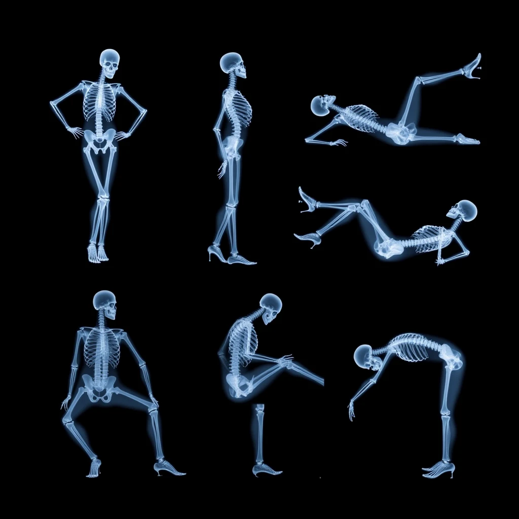 A graphic image displays a grid layout consisting of different skeletal figures in various poses. Each figure is rendered in an X-ray style, allowing visualization of the bones. The background is solid black, enhancing the clarity of the skeletal outlines. The poses include various seated, reclining, and dynamic positions. Some figures wear high-heeled shoes, while others have no visible footwear. The overall expression is neutral, as the focus is on the skeletal structure and poses rather than facial features.