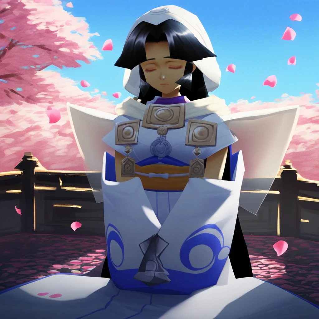 moegi_wedding,1girl,solo,closed eyes,black hair,hood,japanese clothes,petals,sky,long hair,
