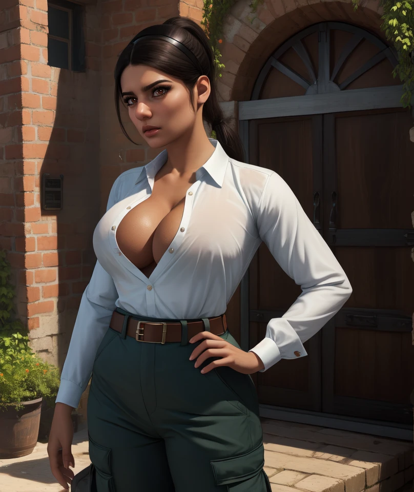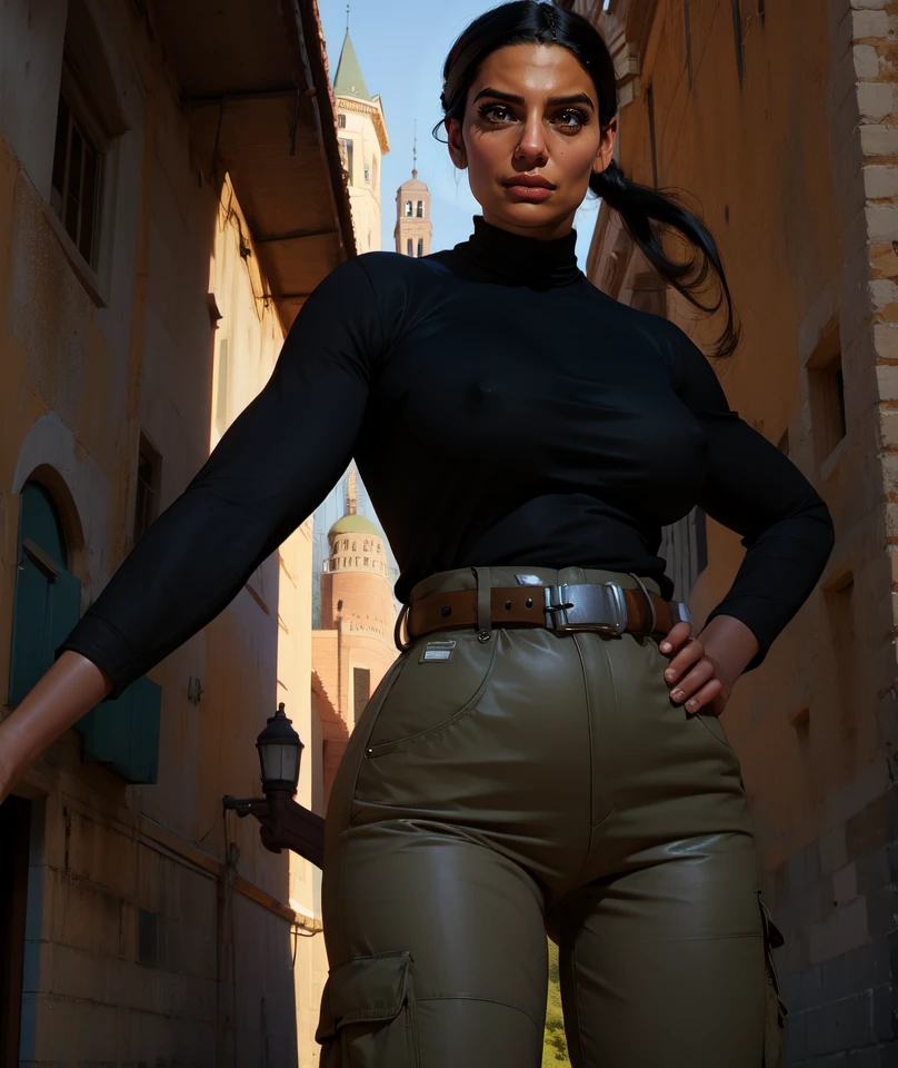 farah, black hair, brown eyes, ponytail,
