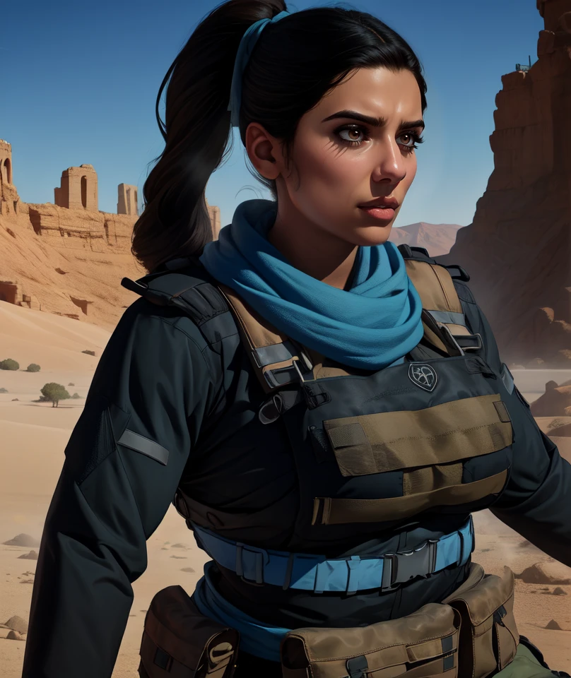 blue scarf, tactical vest, black shirt, long sleeves,
