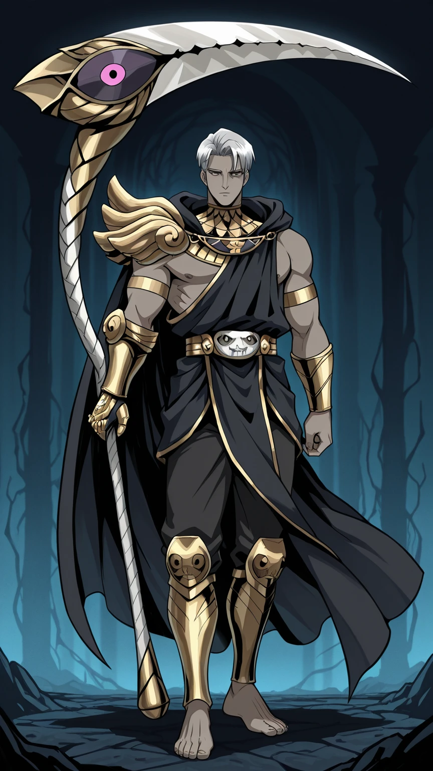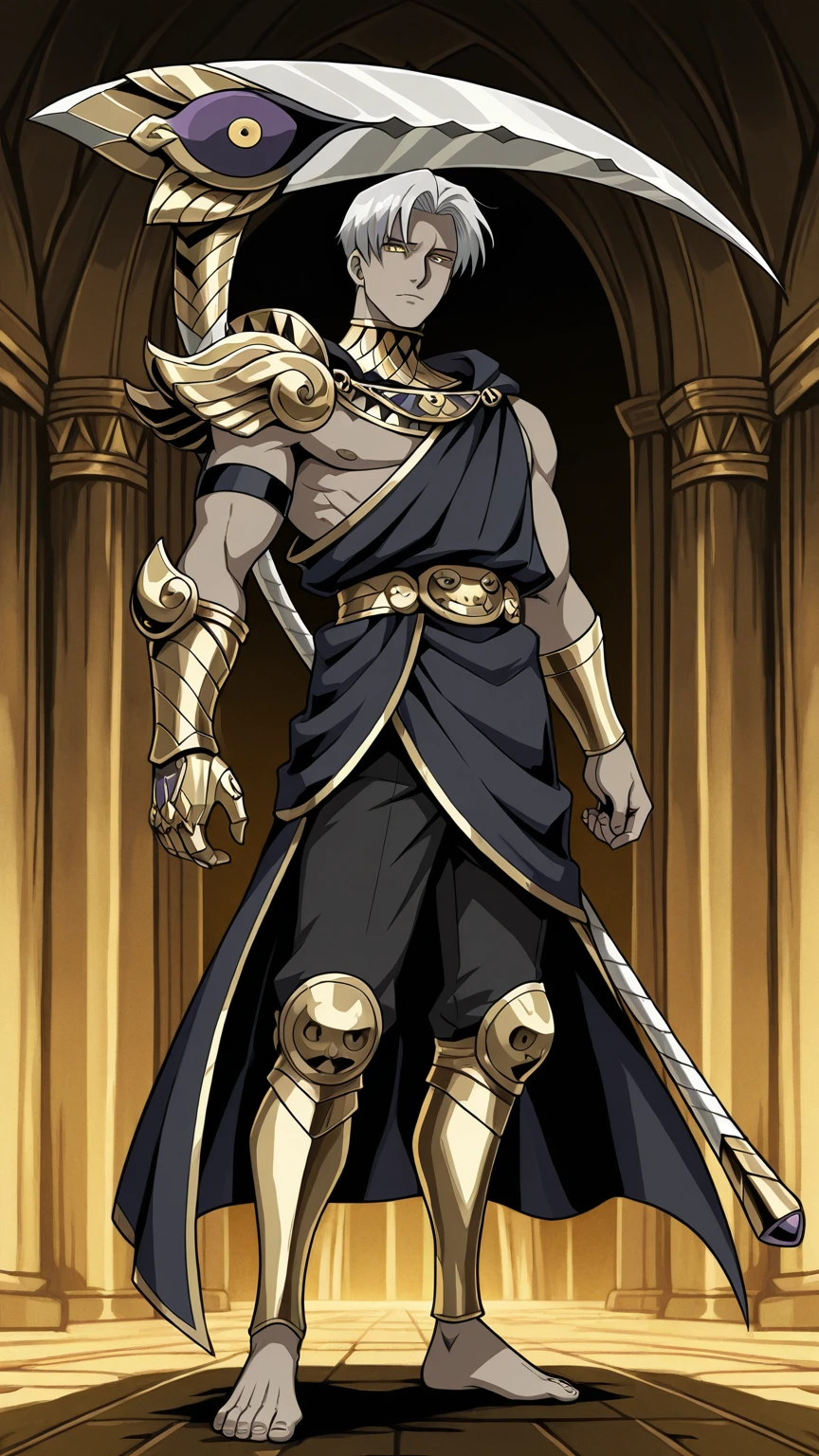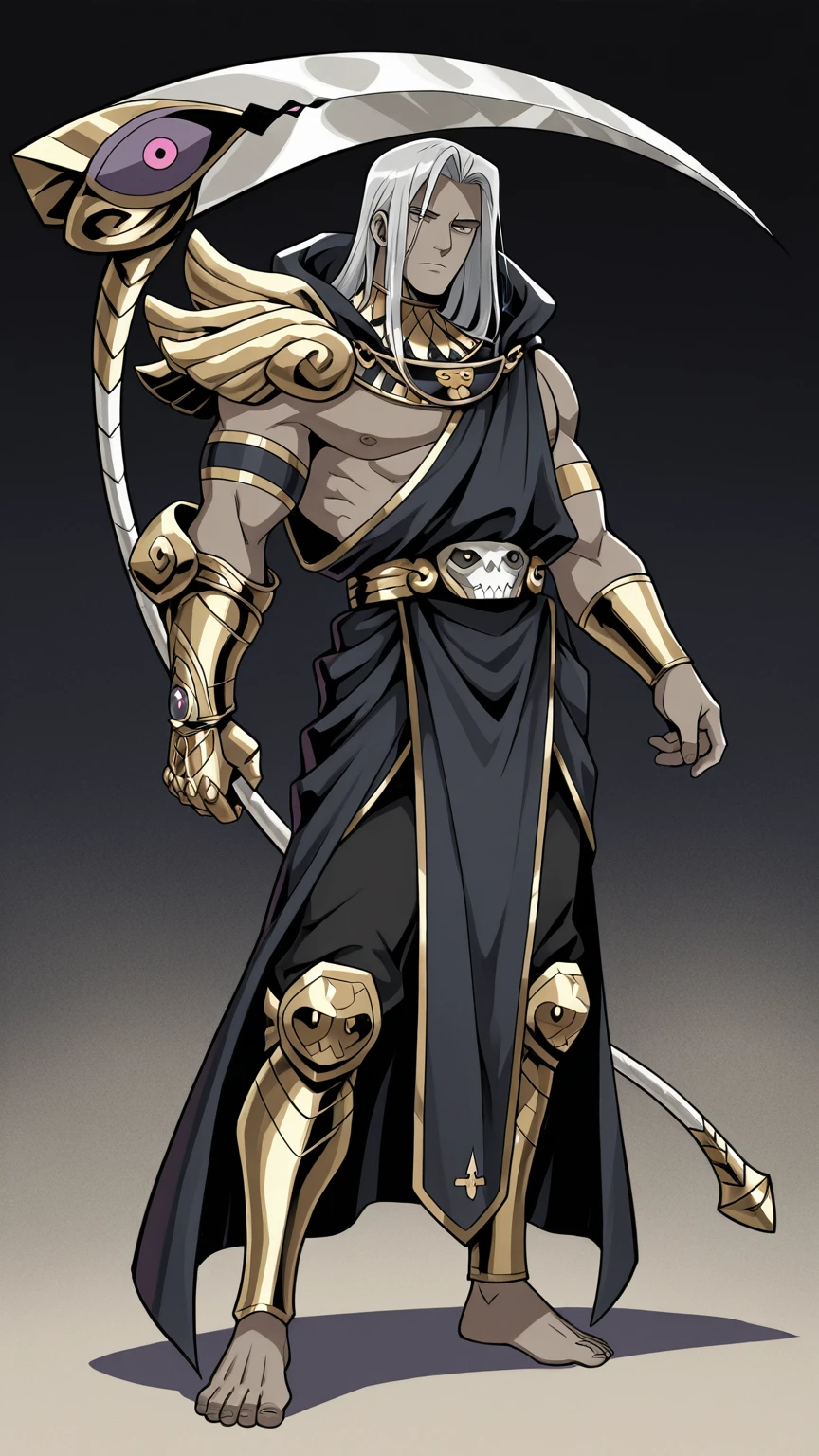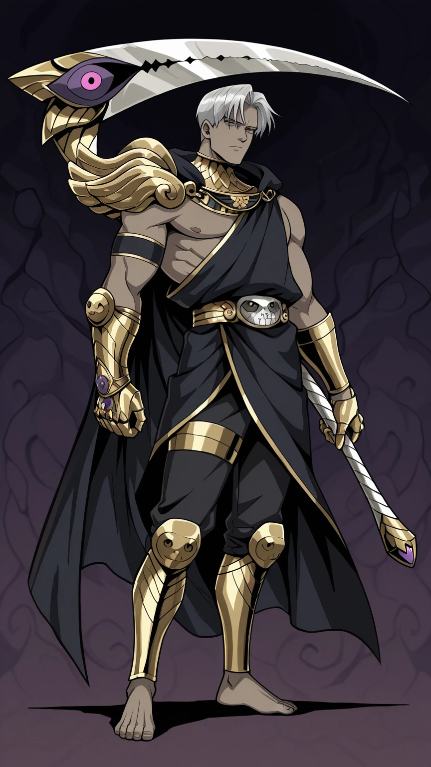 Thanatos, greek clothing, dark skin, silver hair, jewellery, gold leg armour, gold eyes, black pants, gauntlet, holding scythe, barefoot,