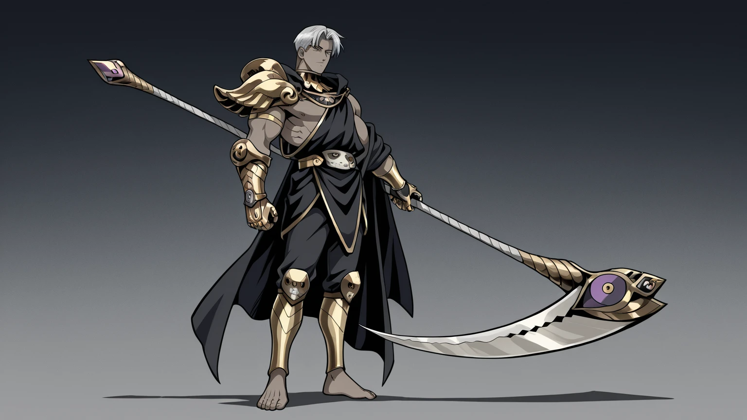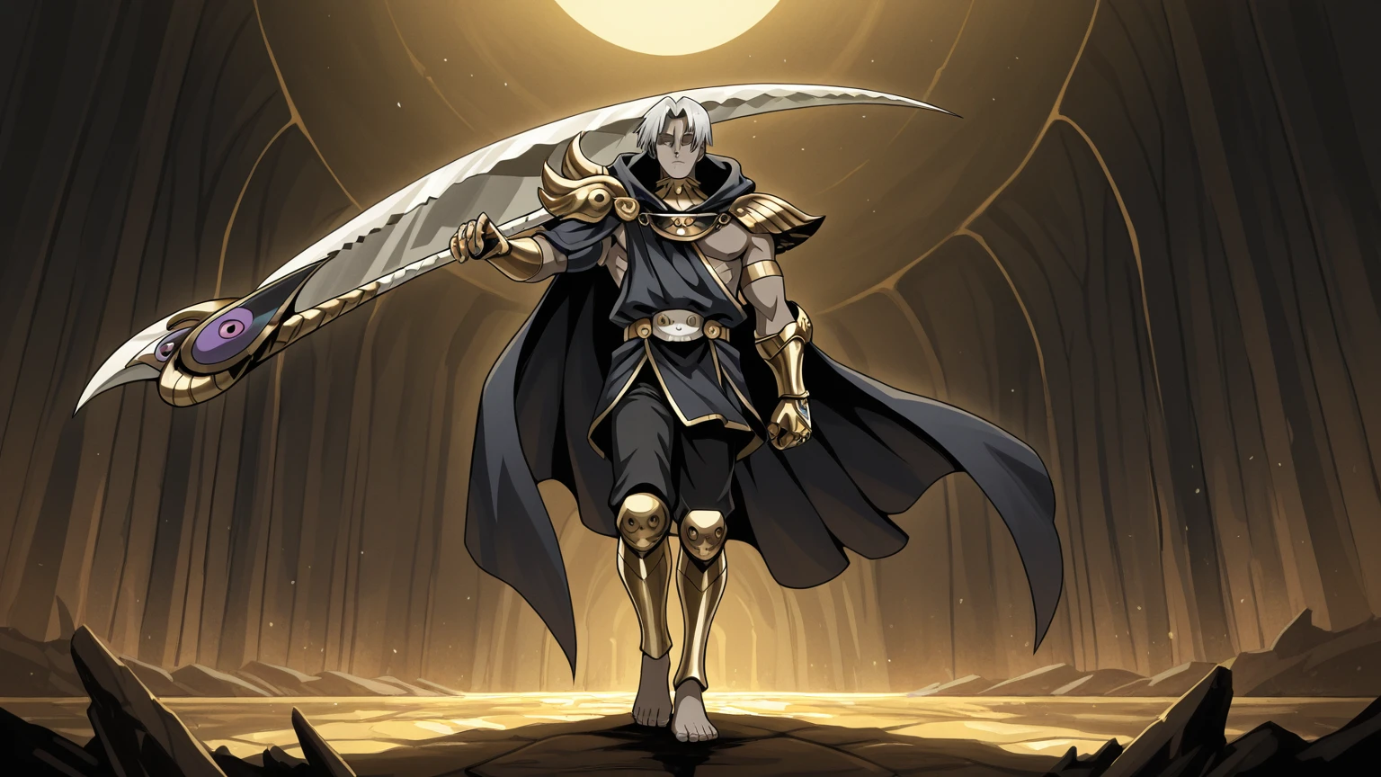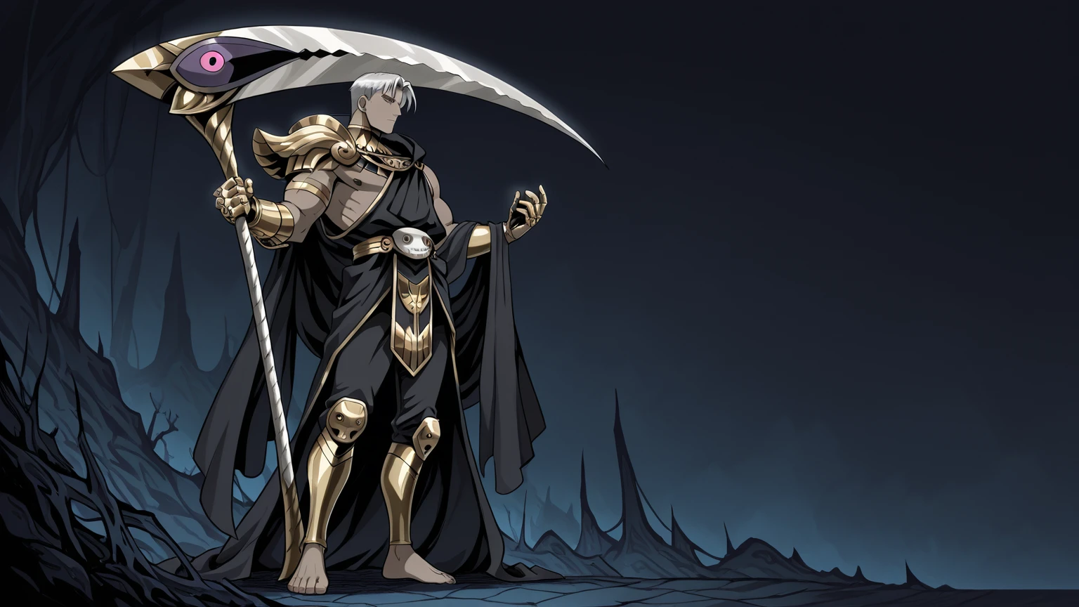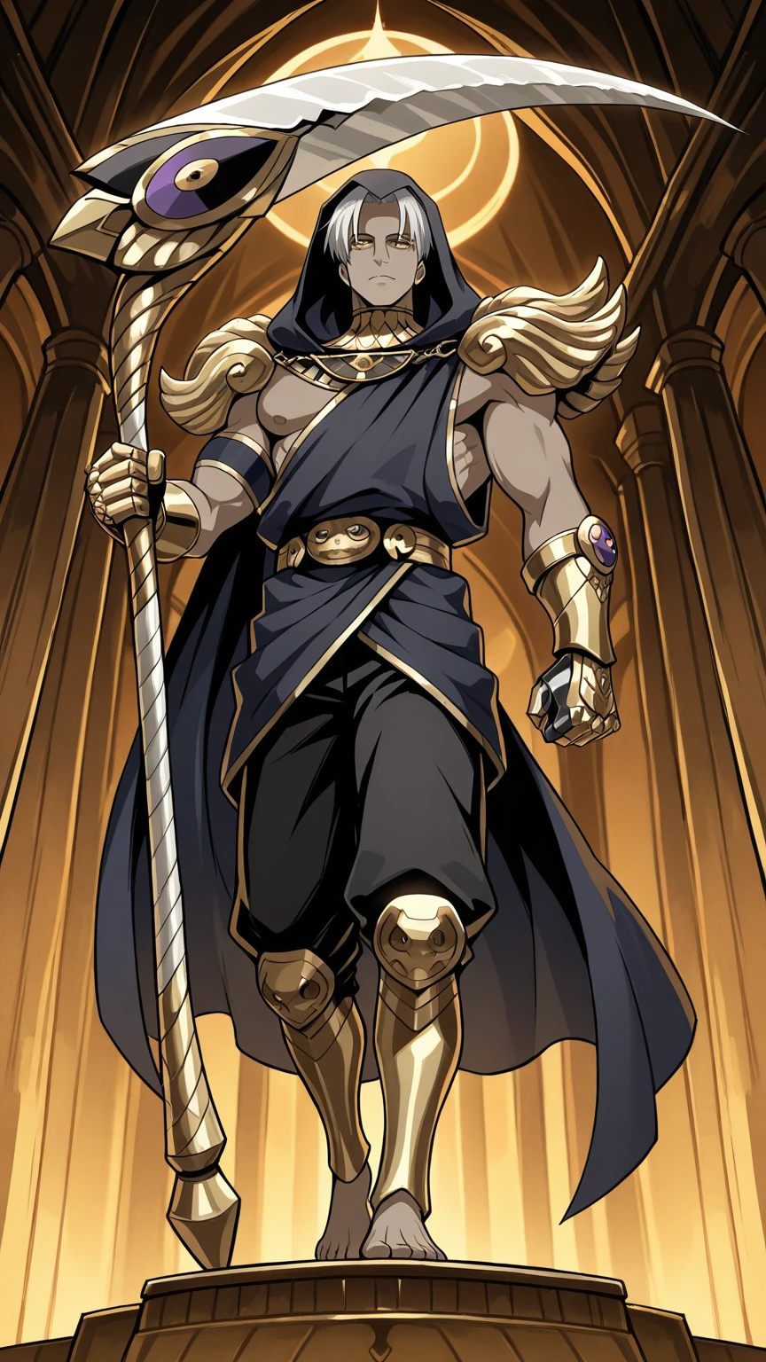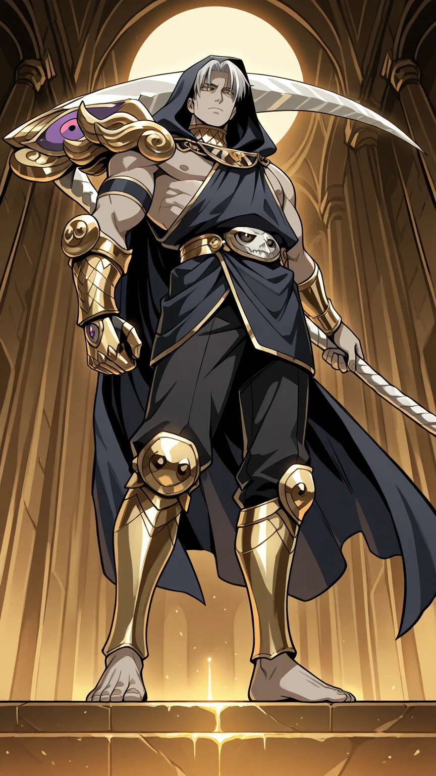 Thanatos, greek clothing, dark skin, silver hair, jewellery, gold leg armour, gold eyes, black pants, gauntlet, holding scythe, barefoot,