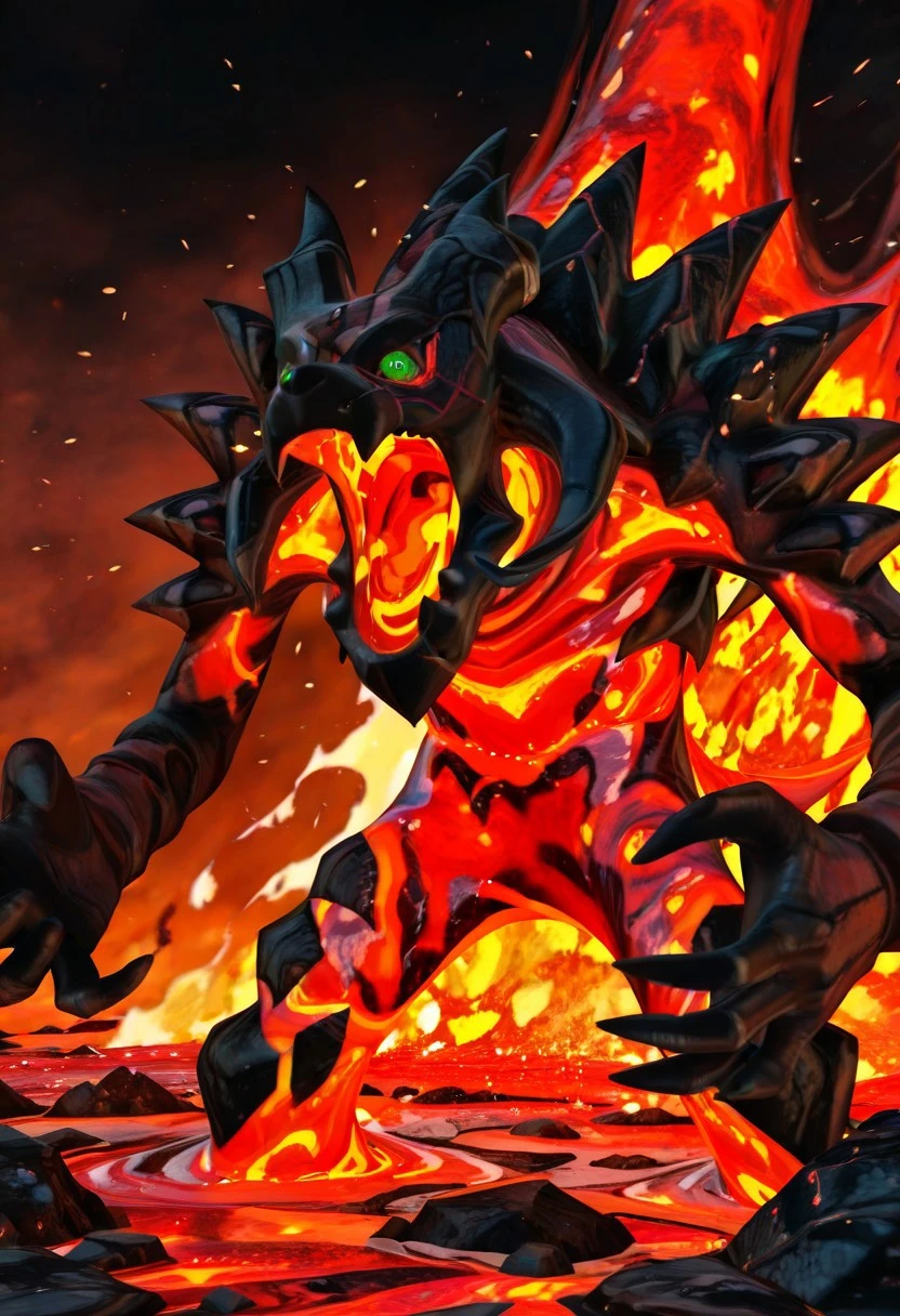 Iblis, magma creature, lava, rock skin, green eyes, horns