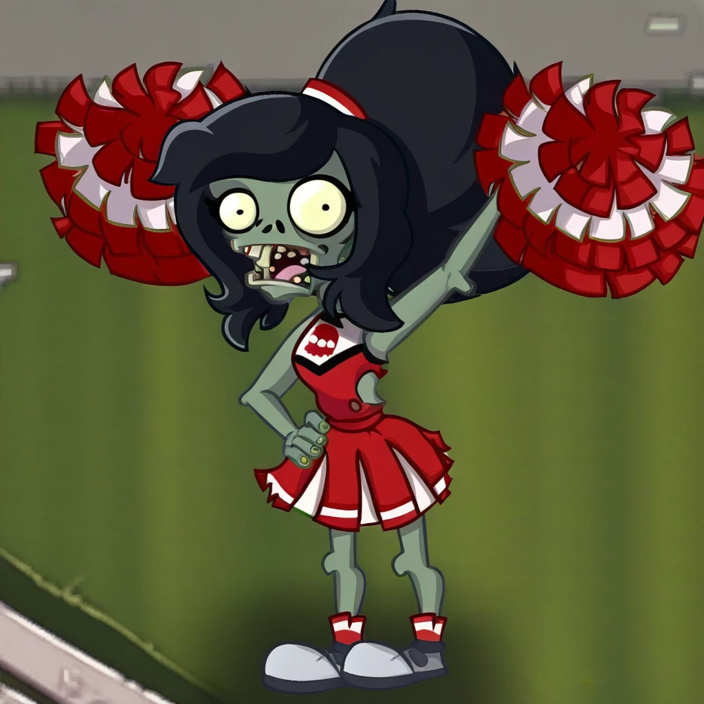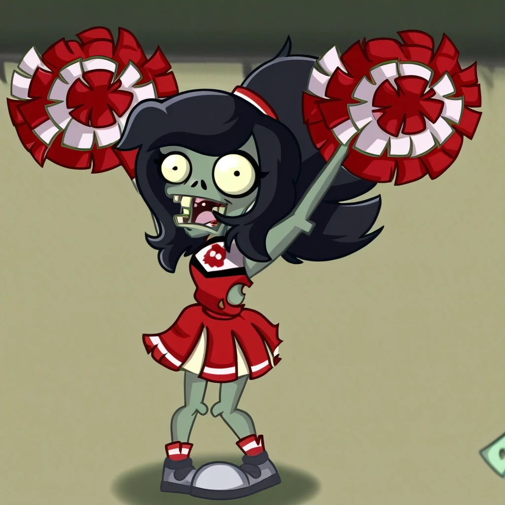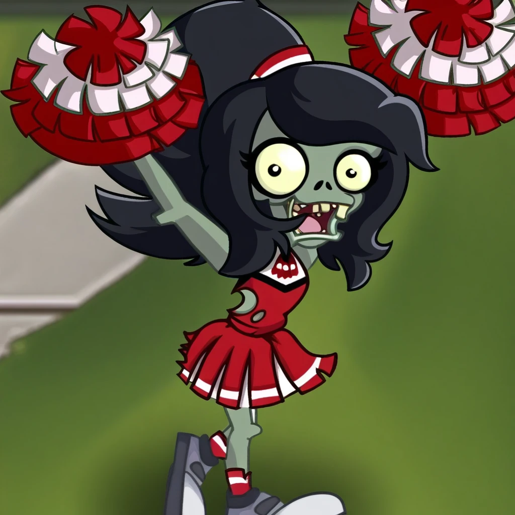 cheerzomb, 1girl, zombie, zombie girl, green skin, colored skin, black hair, ponytail, pom poms, cheerleader, pom pom (cheerleading), red dress, cheering, open mouth, teeth, shoes