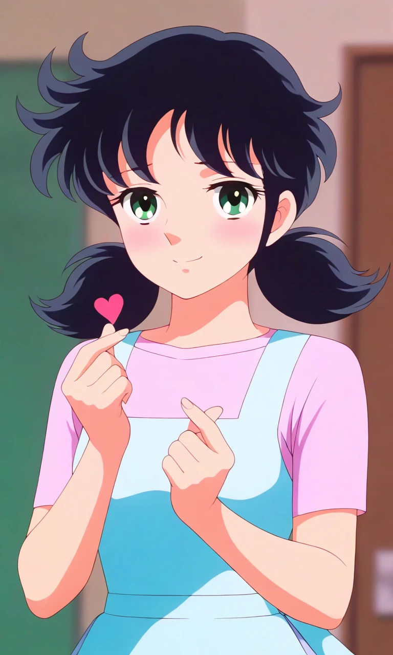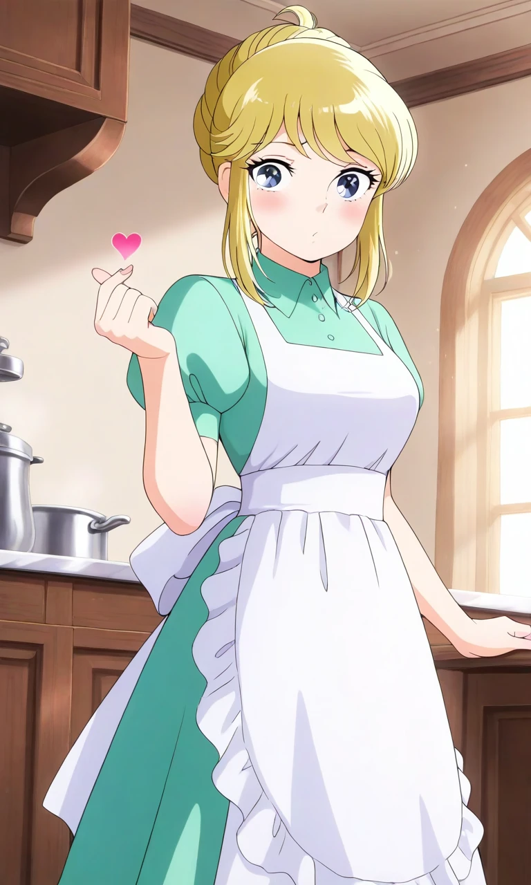 EriiAizawa, blonde hair, green dress,white apron,puffy short sleeves