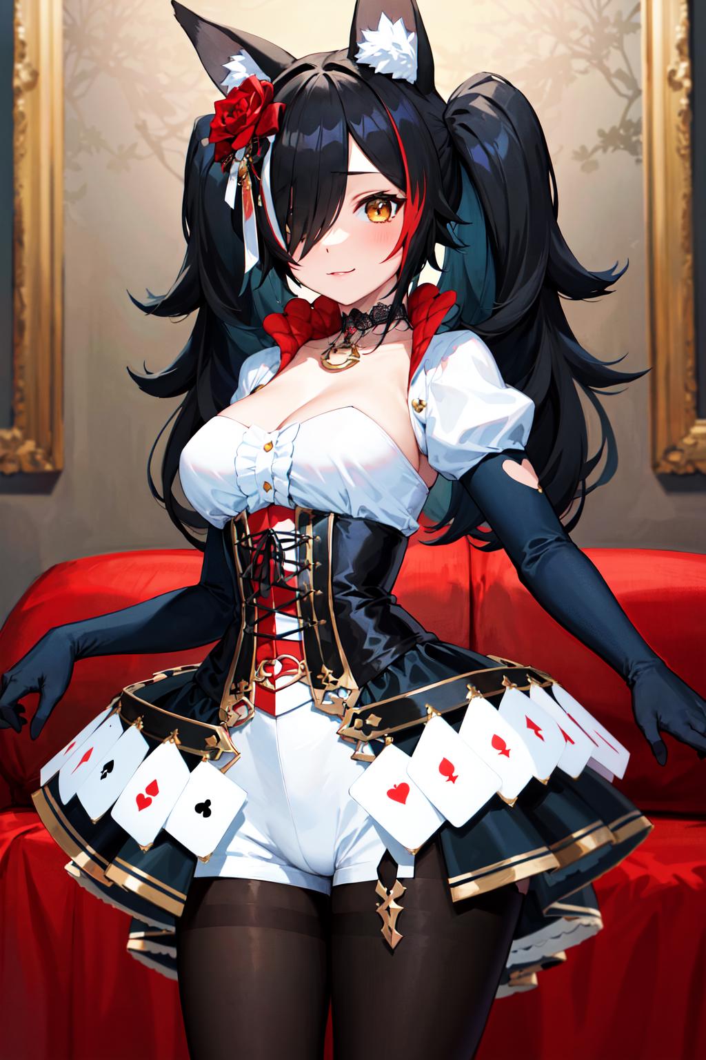 outfit5miosha1, hair flower, twintails, hair over one eye, wolf tail, elbow gloves, playing card, pantyhose, puffy sleeves, corset, choker, two-tone dress