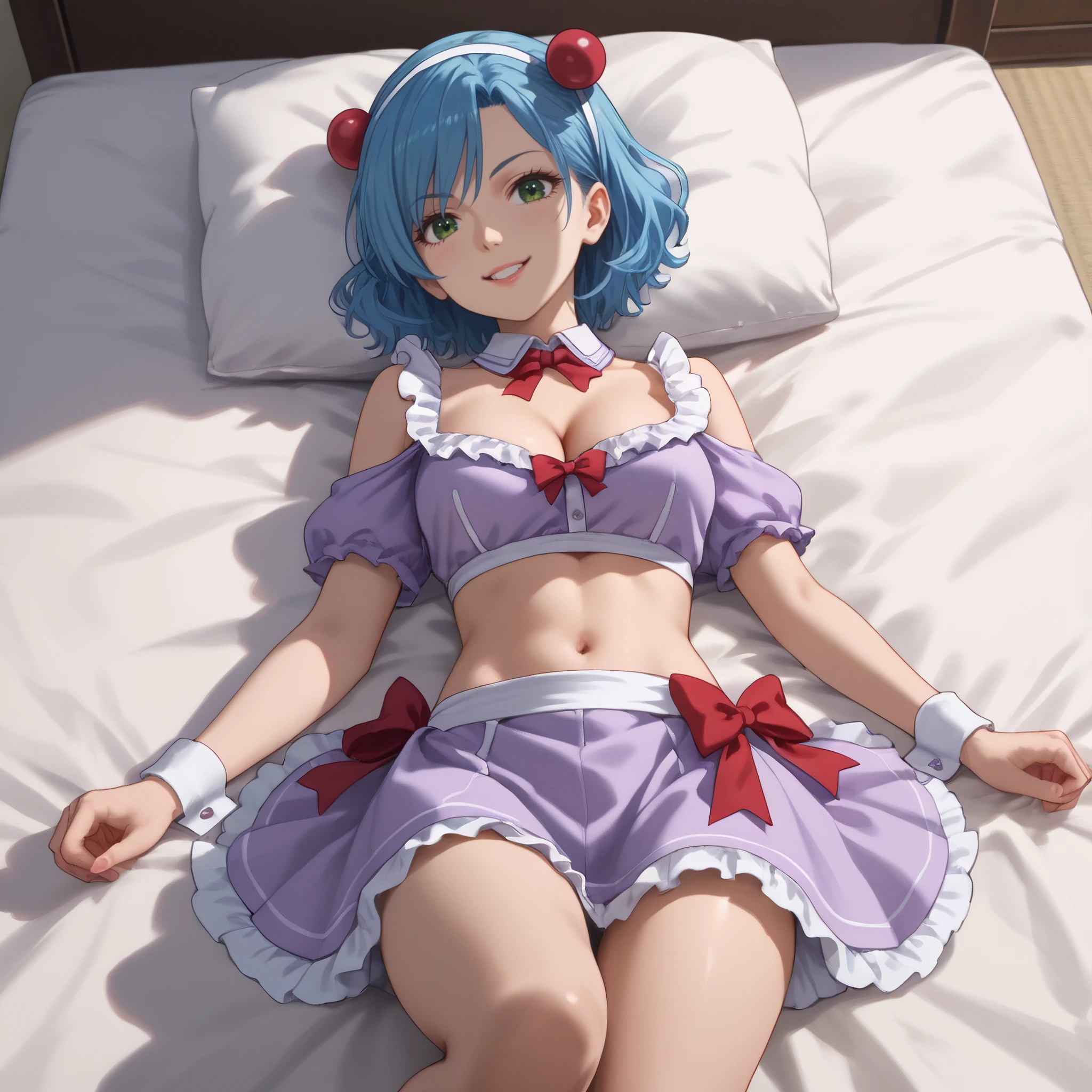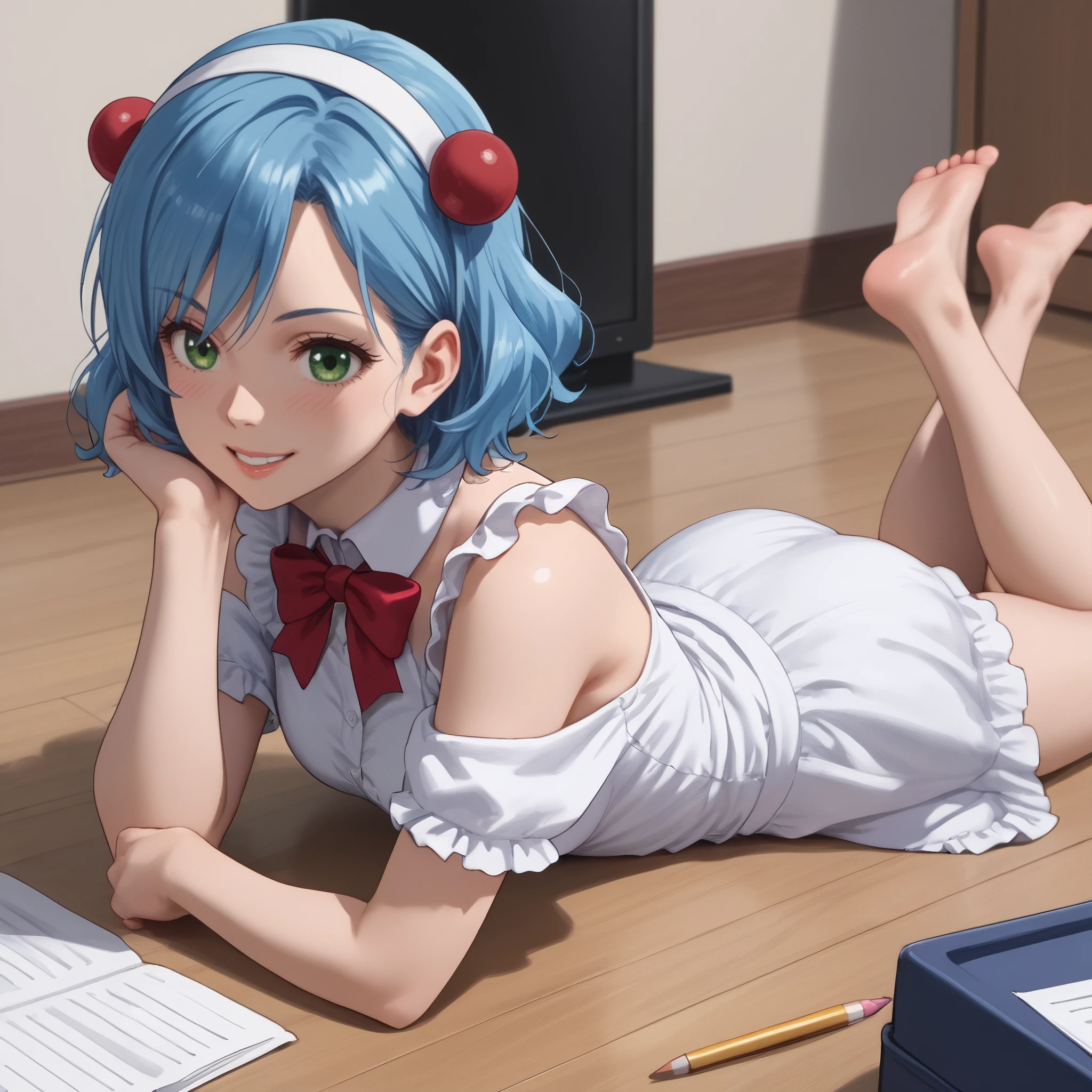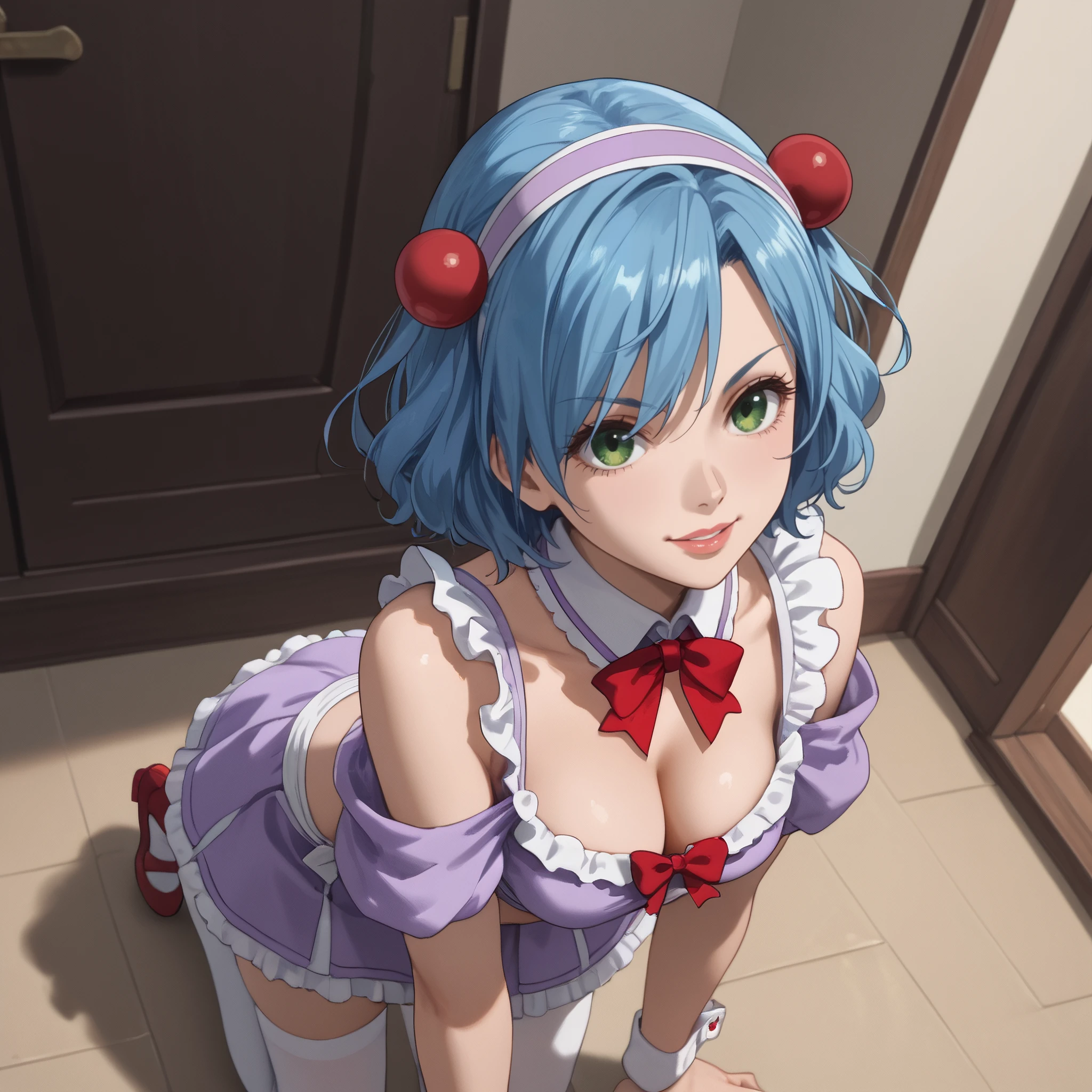 AMWMiyabi, blue hair, short hair, hair ornament, hairband, bow, green eyes, hair bobbles, bangs, eyebrows visible through hair, ribbon, red bow,