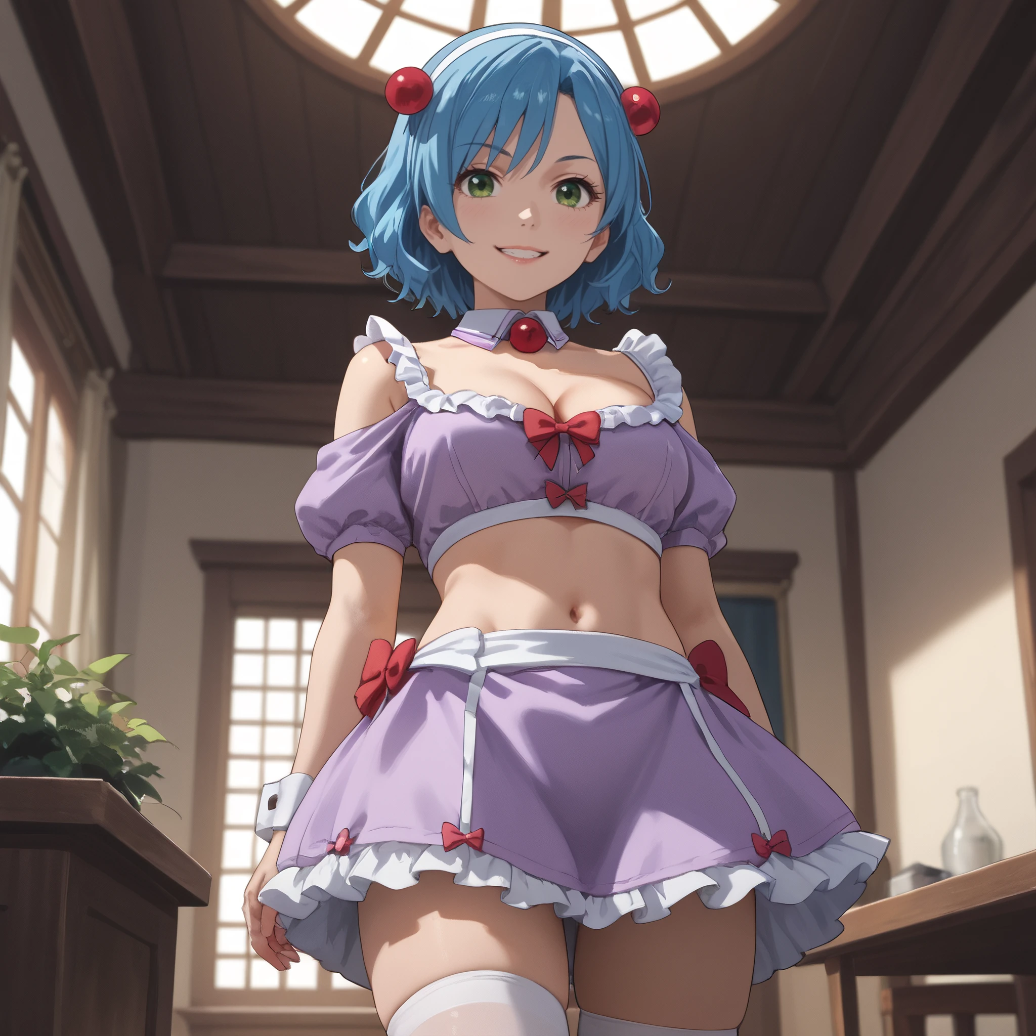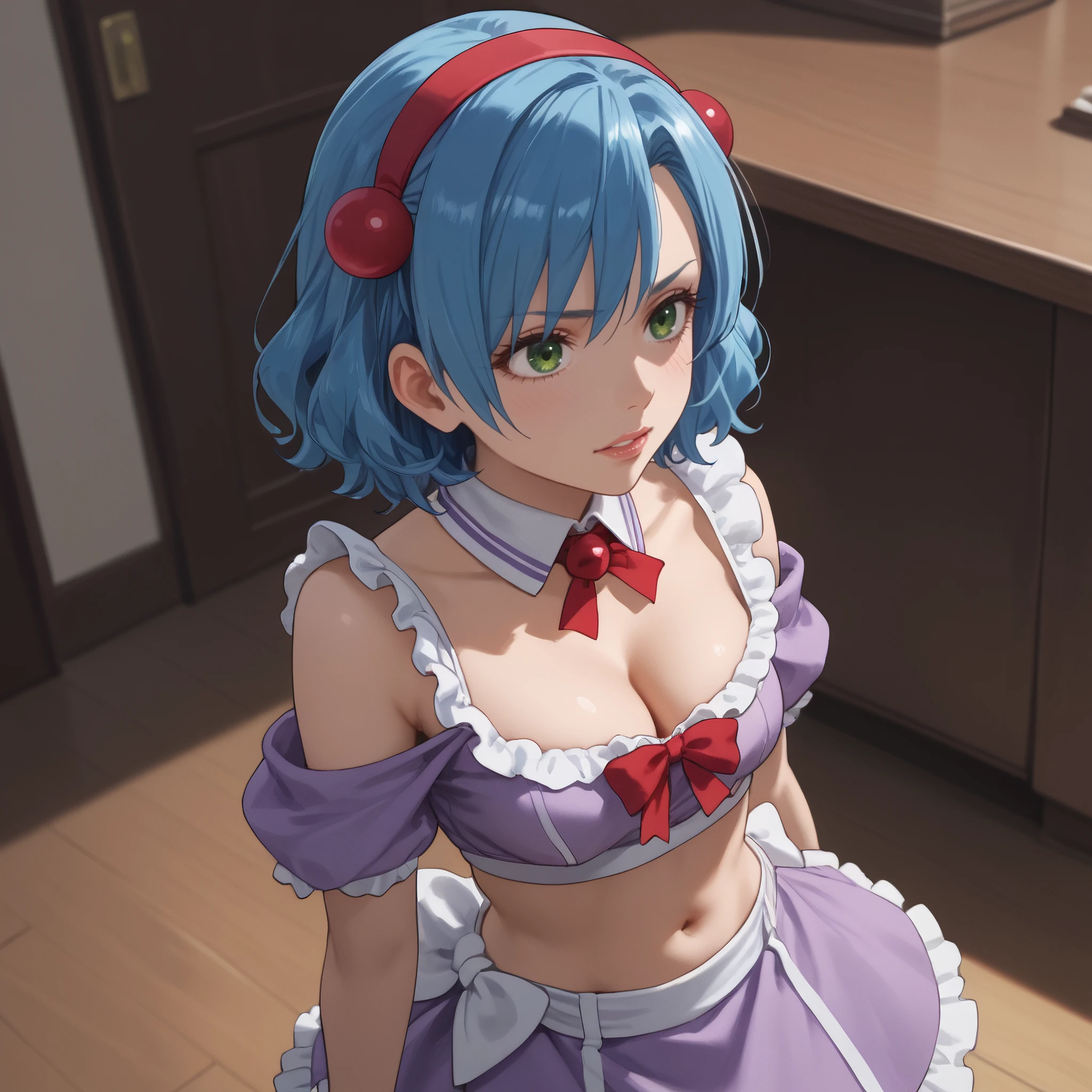 frills, skirt, navel, midriff, bare shoulders, off shoulder, single thighhigh, wrist cuffs, crop top, cleavage, purple skirt, red bow,