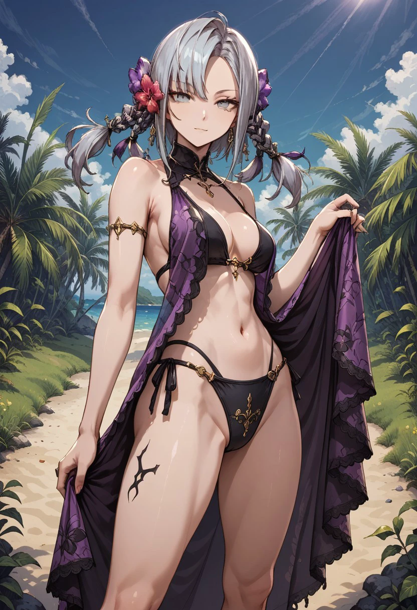 sresnick,1girl,solo,swimsuit,breasts,braid,bikini,hair ornament,navel,cleavage,cup