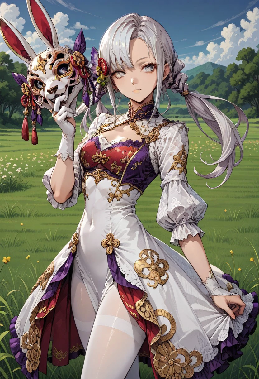 eresnick,1girl,solo,dress,long hair,white dress,hair ornament,twintails,grey eyes